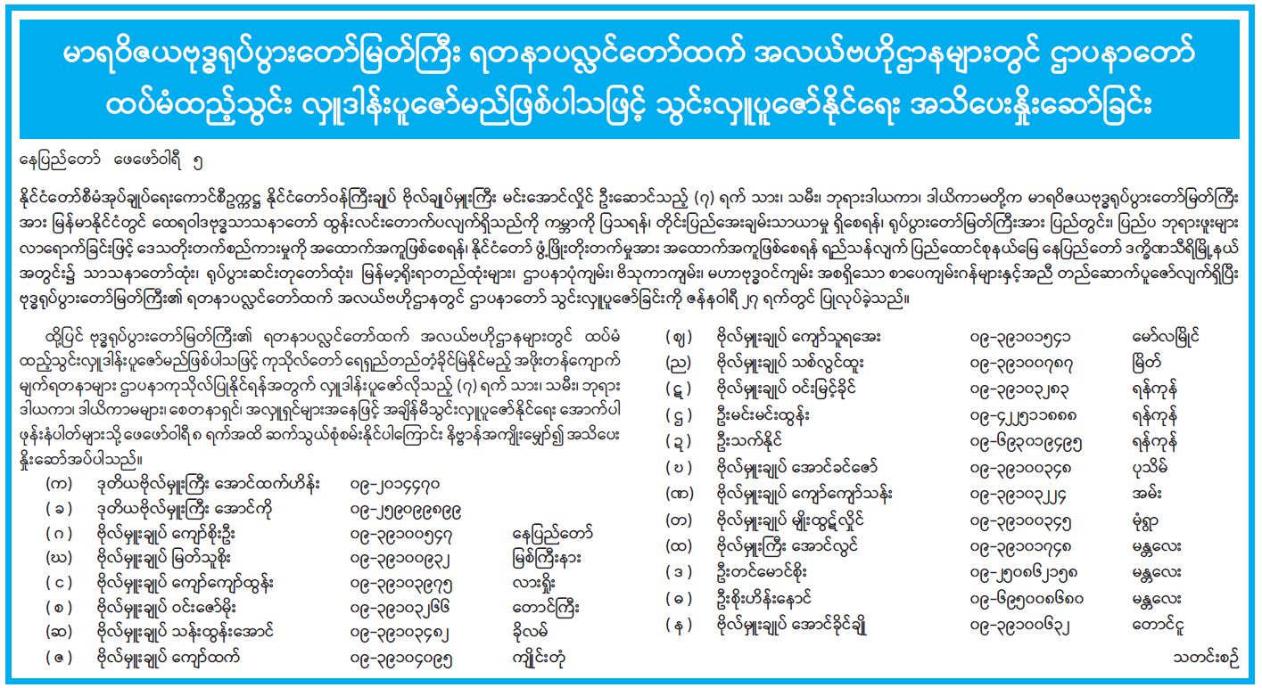 မာရဝိဇယဗုဒ္ဓရုပ်ပွားတော်မြတ်ကြီး ရတနာပလ္လင်တော်ထက် အလယ်ဗဟိုဌာနများတွင် ဌာပနာတော် ထပ်မံထည့်သွင်း လှူဒါန်းပူဇော်မည်ဖြစ်ပါသဖြင့် သွင်းလှူပူဇော်နိုင်ရေး အသိပေးနှိုးဆော်ခြင်း 02/06/2023