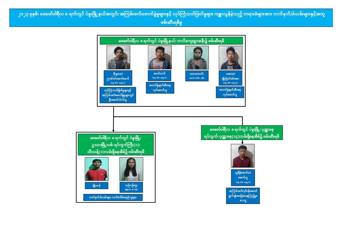သို့ဖြစ်ပါ၍ ဖမ်းဆီးရမိတရားခံများအား ဥပဒေအရ ထိရောက်စွာအရေးယူနိုင်ရေး ဆက်လက်ဆောင်ရွက်သွားမည်ဖြစ်ကြောင်း၊ အကြမ်းဖက်မှုဆောင်ရွက်နေသူများအား ပြည်သူတစ်ရပ်လုံးက ဝိုင်းဝန်းကာကွယ်တိုက်ဖျက်ကြရန်နှင့် ဆက်စပ်တရားခံများအား အမြန်ဆုံးဆက်လက်ဖမ်းဆီးရမိရေးအတွက် ၎င်းတို့ပုန်းခိုရာနေရာများ၊ လှုပ်ရှားသွားလာနေထိုင်မှုသတင်းများရရှိပါက သက်ဆိုင်ရာသို့ လျှို့ဝှက်စွာသတင်းပေး တိုင်ကြားနိုင်ပါကြောင်း၊ သတင်းပေးသူနှင့် ဖမ်းဆီးပေးသူများအား ထိုက်တန်စွာ လျှို့ဝှက်၍ ဆုငွေများချီးမြှင့်ပေးလျက်ရှိကြောင်းနှင့် မြို့ရွာများအမြန်ဆုံးအေးချမ်း တည်ငြိမ်ရေးအတွက် ပြည်သူတစ်ရပ်လုံး ပူးပေါင်းပါဝင်ကြိုးပမ်းဆောင်ရွက်နိုင်ပါရန် မေတ္တာရပ်ခံအပ်ပါကြောင်း အသိပေးသတင်းထုတ်ပြန်အပ်ပါသည်။