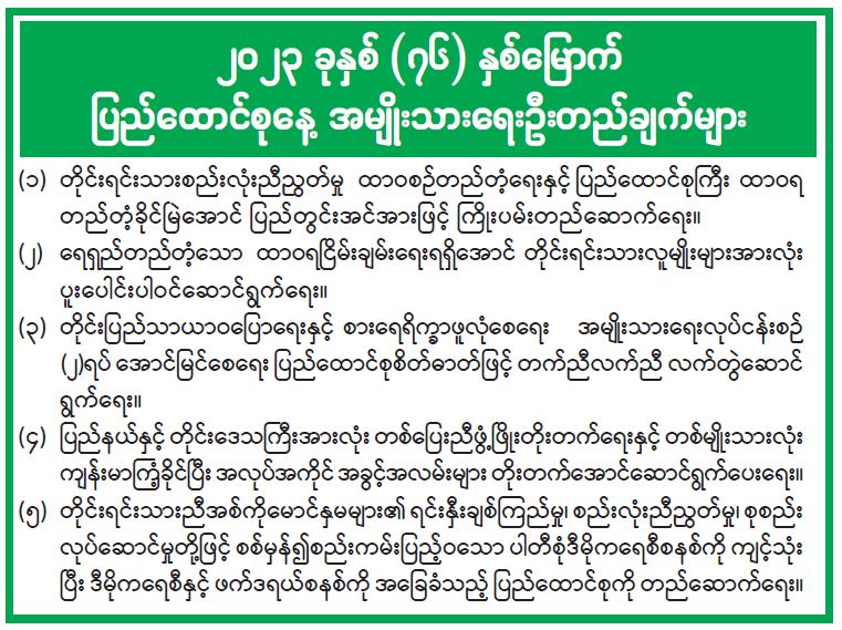 ၂၀၂၃ ခုနှစ် (၇၆)နှစ်မြောက် ပြည်ထောင်စုနေ့ အမျိုးသားရေးဦးတည်ချက်များ