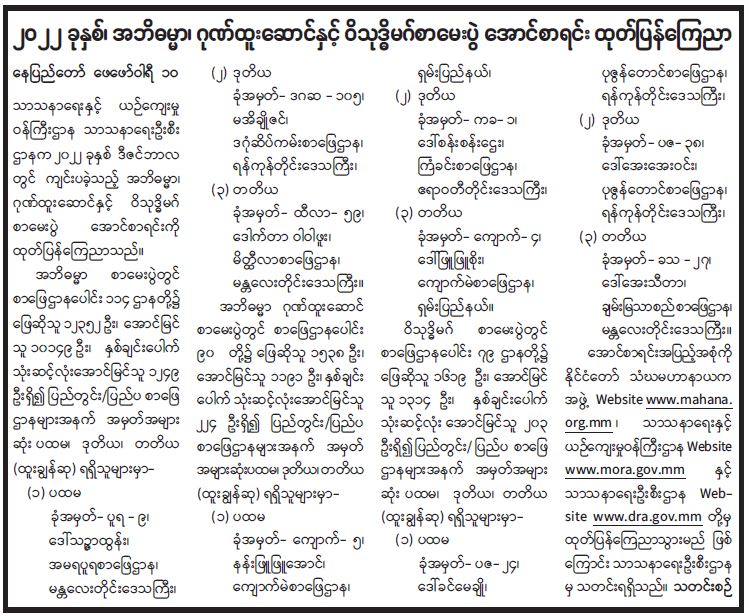၂၀၂၂ ခုနှစ်၊ အဘိဓမ္မာ၊ ဂုဏ်ထူးဆောင်နှင့် ဝိသုဒ္ဓိမဂ်စာမေးပွဲ အောင်စာရင်း ထုတ်ပြန်ကြေညာ