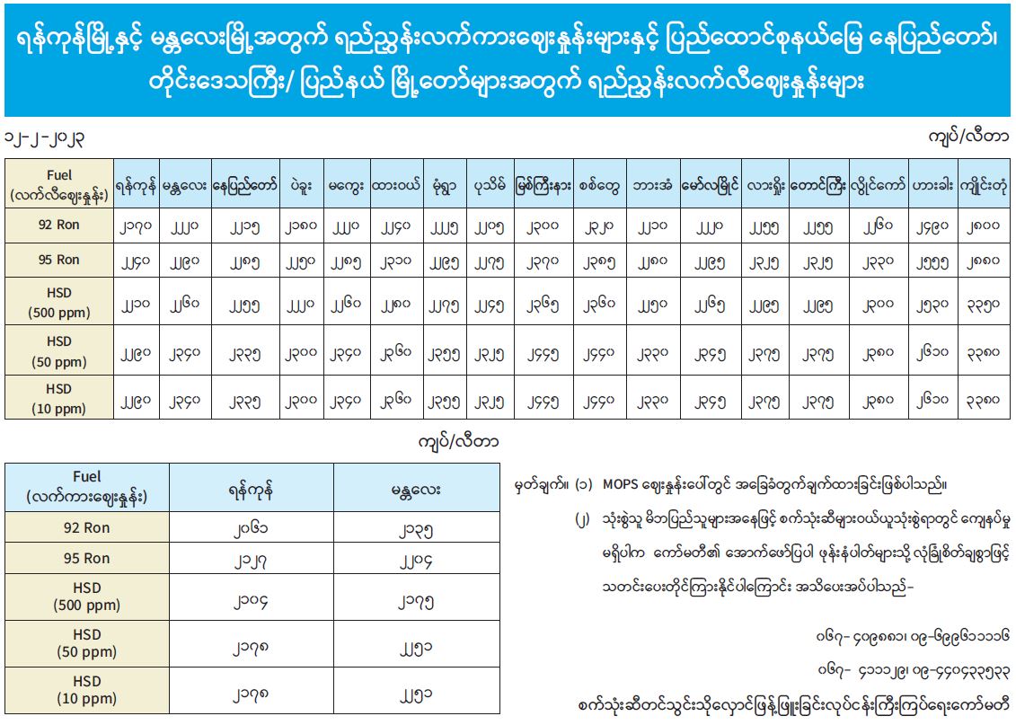 ရန်ကုန်မြို့နှင့် မန္တလေးမြို့အတွက် ရည်ညွှန်းလက်ကားဈေးနှုန်းများနှင့် ပြည်ထောင်စုနယ်မြေ နေပြည်တော်၊ တိုင်းဒေသကြီး/ပြည်နယ် မြို့တော်များအတွက် ရည်ညွှန်းလက်လီဈေးနှုန်းများ