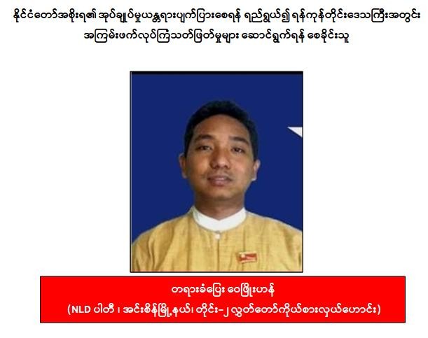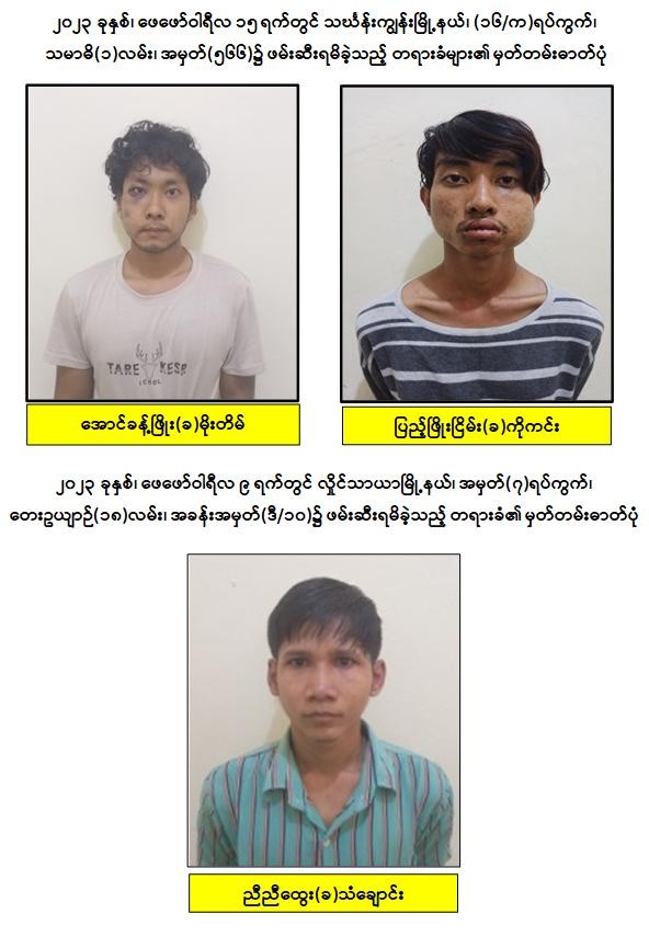ဖမ်းဆီးရမိတရားခံ အောင်ဇော်လင်း(ခ)အောင်ကြီး၏ ထွက်ဆိုချက်အရ ရန်ကုန်တိုင်းဒေသကြီးအတွင်း အပြစ်မဲ့ပြည်သူများအား လုပ်ကြံသတ်ဖြတ်မှုများ ကျူးလွန်ခဲ့သည့် လှိုင် PDF အမည်ခံအကြမ်းဖက်အဖွဲ့ဝင် အောင်ခန့်ဖြိုး(ခ)မိုးတိမ် နှင့် ပြည့်ဖြိုးငြိမ်း(ခ)ကိုကင်း တို့ ၂ ဦးအား ဖေဖော်ဝါရီလ ၉ ရက် နေ့လယ်ပိုင်းတွင် သင်္ဃန်းကျွန်းမြို့နယ်၊ (၁၆/က)ရပ်ကွက်၊ သမာဓိ(၁)လမ်း၊ အမှတ်(၅၅၆)နေအိမ်၌လည်းကောင်း၊ ညီညီထွေး(ခ)သံချောင်းအား လှိုင်သာယာမြို့နယ်၊ အမှတ်(၇)ရပ်ကွက်၊ တေးဥယျာဉ်(၁၈)လမ်း၊ အခန်းအမှတ်(ဒီ/၁၀)၌လည်းကောင်း အသီးသီးထပ်မံဖမ်းဆီးရမိခဲ့သည်။