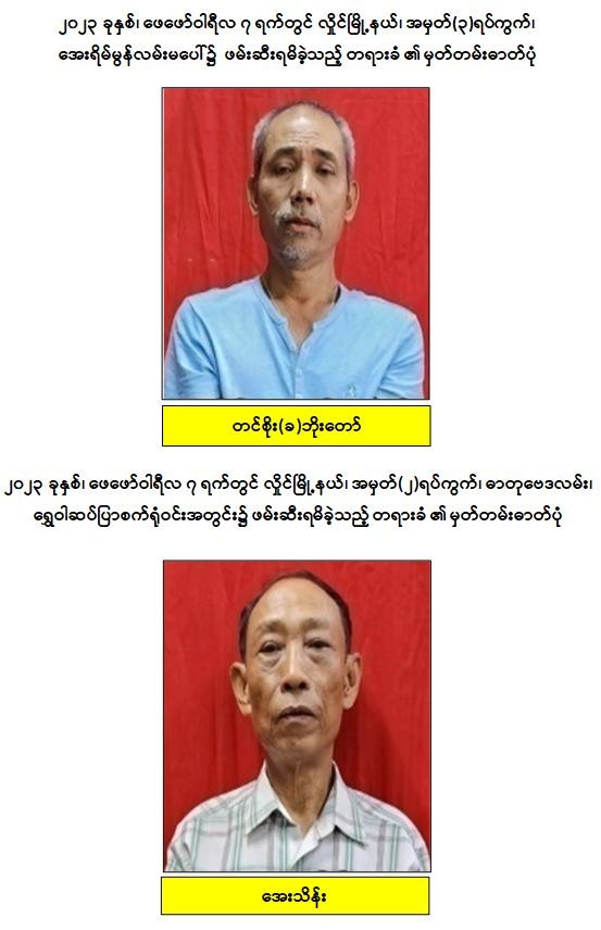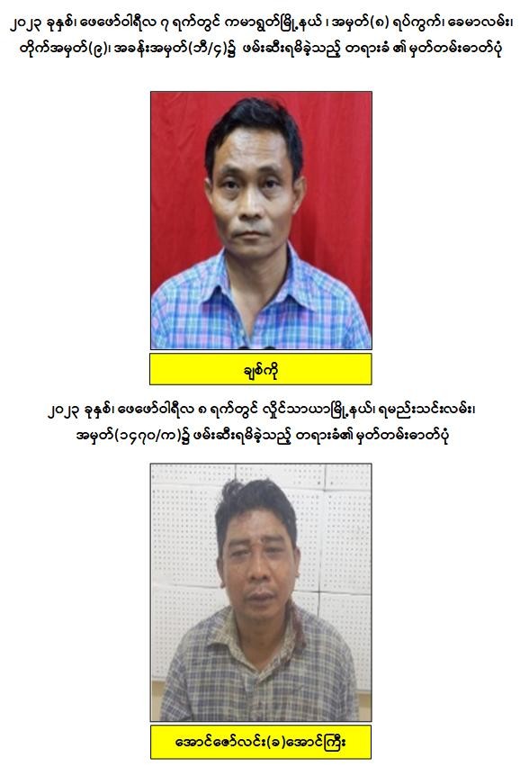 သို့ဖြစ်ပါ၍ ဖမ်းဆီးရမိတရားခံများအား ဥပဒေအရ ၎င်းတို့ကျူးလွန်ခဲ့သော ပြစ်မှုများအတိုင်း ထိရောက်စွာအရေးယူနိုင်ရေး ဆက်လက်ဆောင်ရွက်သွားမည်ဖြစ်ပြီး အကြမ်းဖက်မှုဆောင်ရွက်နေသူများအား ပြည်သူတစ်ရပ်လုံးက ဝိုင်းဝန်းကာကွယ်တိုက်ဖျက်ကြရန်နှင့် ဆက်စပ်တရားခံများအား အမြန်ဆုံးဆက်လက်ဖမ်းဆီးရမိရေးအတွက် ၎င်းတို့ပုန်းခိုရာနေရာများ၊ လှုပ်ရှားသွားလာနေထိုင်မှု သတင်းများရရှိပါက သက်ဆိုင်ရာသို့ လျှို့ဝှက်စွာသတင်းပေးတိုင်ကြားနိုင်ပါကြောင်း၊ သတင်းပေးသူနှင့် ဖမ်းဆီးပေးသူများအား ထိုက်တန်စွာလျှို့ဝှက်၍ ဆုငွေများချီးမြှင့်ပေးလျက် ရှိကြောင်းနှင့် မြို့ရွာများအမြန်ဆုံးအေးချမ်းတည်ငြိမ်ရေးအတွက် ပြည်သူတစ်ရပ်လုံး ပူးပေါင်းပါဝင်ကြိုးပမ်း ဆောင်ရွက်နိုင်ပါရန် မေတ္တာရပ်ခံအပ်ပါကြောင်း အသိပေးသတင်းထုတ်ပြန်အပ်ပါသည်။