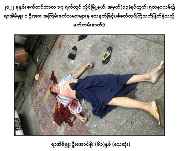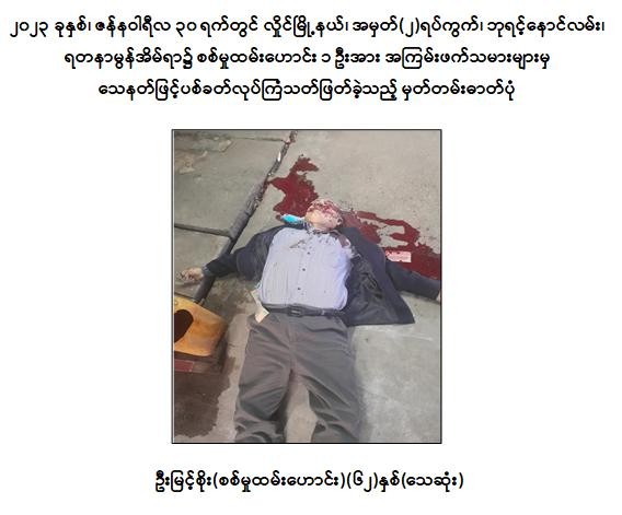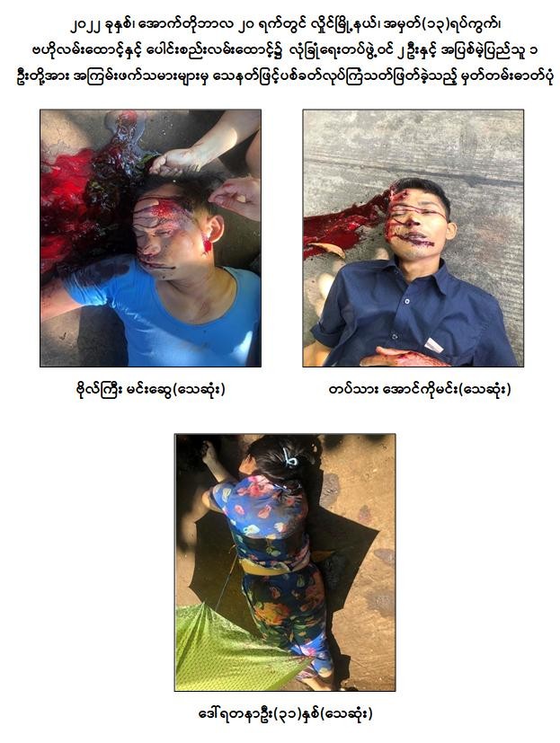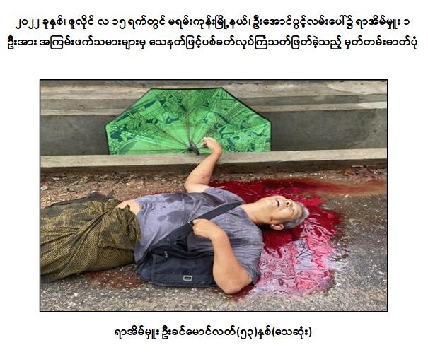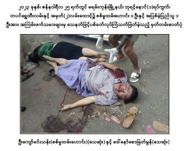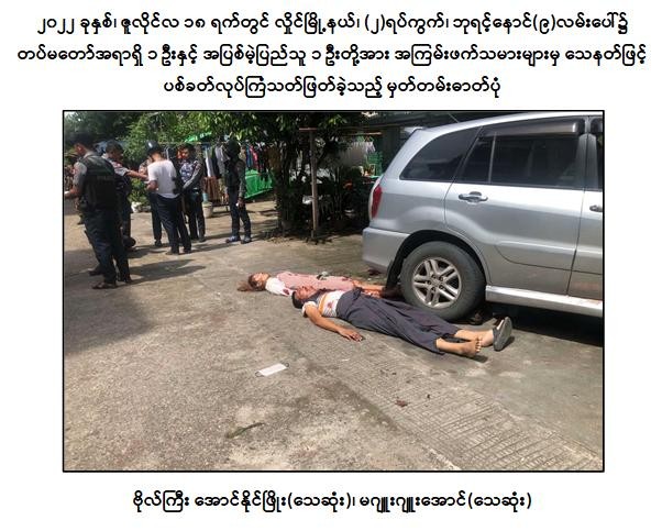 (က) ၂၀၂၂ ခုနှစ်၊ ဇူလိုင်လ ၄ ရက်တွင် ကမာရွတ်မြို့နယ်၊ အမှတ်(၃) ရပ်ကွက်၊ လှည်းတန်း(၂)လမ်းထိပ်၌ အပြစ်မဲ့ပြည်သူ ၃ ဦးအား ဒလန်ဟုစွပ်စွဲ၍ ပြည့်ဖြိုးငြိမ်း(ခ)ကိုကင်း နှင့် ညီညီထွေး(ခ)သံချောင်းတို့မှ ပစ္စတိုဖြင့် အကြောင်းမဲ့ပစ်ခတ်လုပ်ကြံသတ်ဖြတ်ခဲ့ပြီး အပြစ်မဲ့ပြည်သူ ၂ ဦးသေဆုံး၍ ၁ ဦးဒဏ်ရာရရှိခဲ့မှုတွင် အောင်ဇော်လင်း(ခ)အောင်ကြီးမှ အခြေအနေစောင့်ကြည့်ပေးခဲ့ကြောင်း။