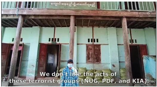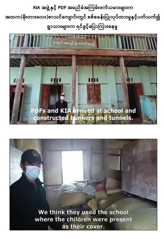 ၃။ သို့သော် NUG၊ CRPH နှင့် ၎င်းတို့၏လက်ဝေခံ PDF အမည်ခံအကြမ်းဖက်အဖွဲ့များနှင့် သောင်းကျန်းသူအဖွဲ့အစည်းများသည် အစိုးရဆန့်ကျင်ရေးကို အကြောင်းပြ၍ စာသင် ကျောင်းများအား အတင်းအဓမ္မပိတ်ခိုင်းပြီး စစ်စခန်းများအဖြစ် အသုံးပြုလျက်ရှိရာ ၂၀၂၃ ခုနှစ်၊ ဇန်နဝါရီ ၃၀ ရက်တွင် စစ်ကိုင်းတိုင်းဒေသကြီး၊ ကသာမြို့နယ်၊ မိုးတားလေးကျေးရွာရှိ အထက (မိုးတားလေး) စာသင်ကျောင်းအတွင်း၌ KIA အဖွဲ့နှင့် PDF အမည်ခံအကြမ်းဖက်အဖွဲ့များက တပ်မတော်စစ်ကြောင်းများအားတိုက်ခိုက်ရန် စာသင်ကျောင်းဝန်းအတွင်း စစ်စခန်းသဖွယ် ဘန်ကာများ ဆောက်လုပ်ထားခြင်း၊ ကတုတ်ကျင်းများ ပြုလုပ်ထားခြင်း၊ သဲအိတ်ဘန်ကာများ ပြုလုပ်ထားခြင်းတို့ကို တွေ့ရှိရပြီး KIA အဖွဲ့နှင့် PDF အမည်ခံအကြမ်းဖက်အဖွဲ့များသည် ဒေသခံပြည်သူများအား လက်နက်အားကိုးဖြင့် အနိုင်ကျင့်ပြီး စာသင်ကျောင်းများအား စစ်စခန်းများအဖြစ် အသုံးချလျက်ရှိကြောင်း ကိုယ်တိုင်မျက်မြင် ကြုံတွေ့ခဲ့ရသည့် ရွာသားများ၏ ရင်ဖွင့် စကားသံများကိုလည်း ယခုကဲ့သို့ ကြားသိခဲ့ရပါသည်-
