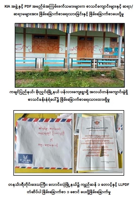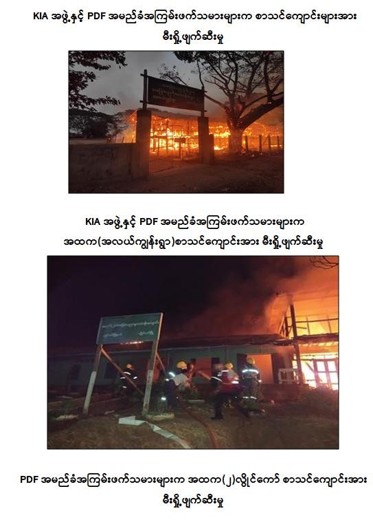 ၆။ သို့ဖြစ်ပါ၍ KIA အဖွဲ့နှင့် NUG၊ CRPH နှင့် ၎င်းတို့၏လက်ဝေခံ PDF အမည်ခံ အကြမ်းဖက် အဖွဲ့များသည် နိုင်ငံတော်၏အနာဂတ်ဖြစ်သော ကလေးသူငယ်များ၏ ပညာသင်ကြားရေးကို ဖျက်ဆီးပြီး ၎င်းတို့၏လက်နက်ကိုင်တိုက်ခိုက်မှုအတွက် စာသင်ကျောင်းများအား စစ်စခန်းများ သဖွယ် အကာအကွယ်ယူ အသုံးချတိုက်ခိုက်နေမှုများအား နိုင်ငံတကာက သိရှိနိုင်ရန် အသိပေး သတင်းထုတ်ပြန်အပ်ပါသည်။