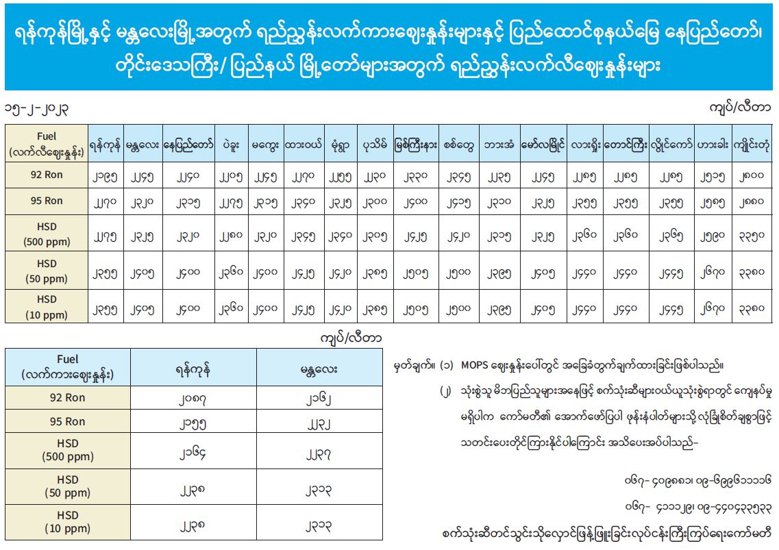 ရန်ကုန်မြို့နှင့် မန္တလေးမြို့အတွက် ရည်ညွှန်းလက်ကားဈေးနှုန်းများနှင့် ပြည်ထောင်စုနယ်မြေ နေပြည်တော်၊ တိုင်းဒေသကြီး/ ပြည်နယ် မြို့တော်များအတွက် ရည်ညွှန်းလက်လီဈေးနှုန်းများ 02/16/2023
