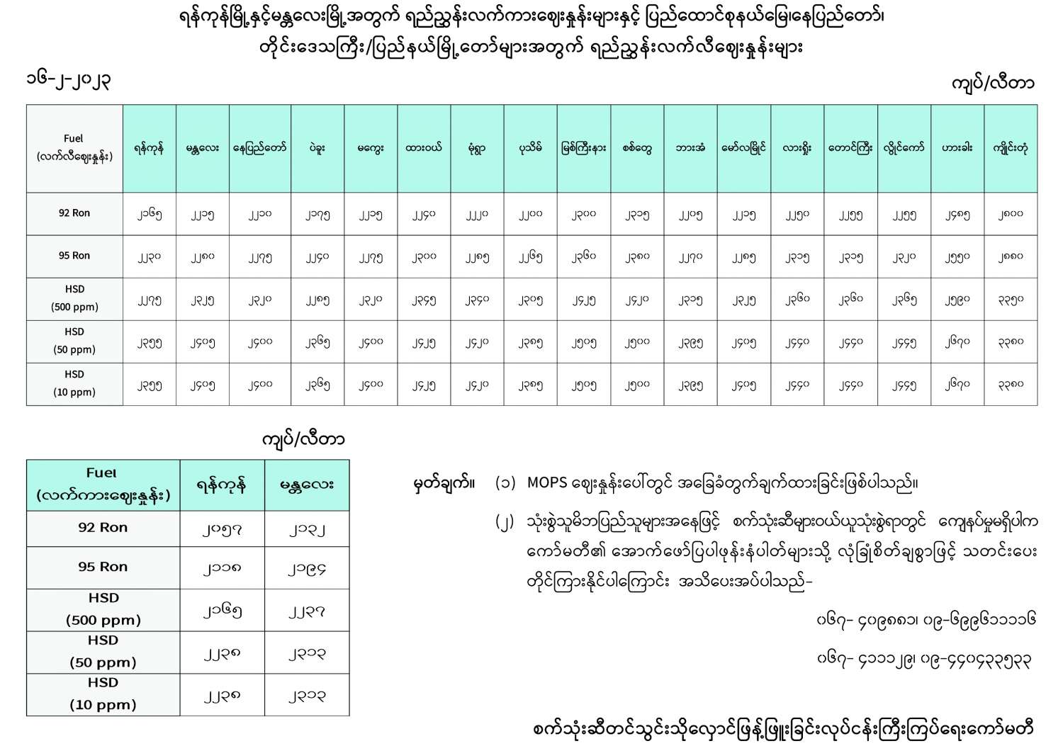 ရန်ကုန်မြို့နှင့်မန္တလေးမြို့အတွက် ရည်ညွှန်းလက်ကားဈေးနှုန်းများနှင့် ပြည်ထောင်စုနယ်မြေ နေပြည်တော်၊ တိုင်းဒေသကြီး/ပြည်နယ် မြို့တော်များအတွက် ရည်ညွှန်းလက်လီဈေးနှုန်းများ 02/16/2023