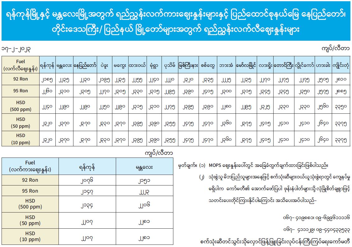 ရန်ကုန်မြို့နှင့် မန္တလေးမြို့အတွက် ရည်ညွှန်းလက်ကားဈေးနှုန်းများနှင့် ပြည်ထောင်စုနယ်မြေ နေပြည်တော်၊ တိုင်းဒေသကြီး/ပြည်နယ် မြို့တော်များအတွက် ရည်ညွှန်းလက်လီဈေးနှုန်းများ 02/17/2023