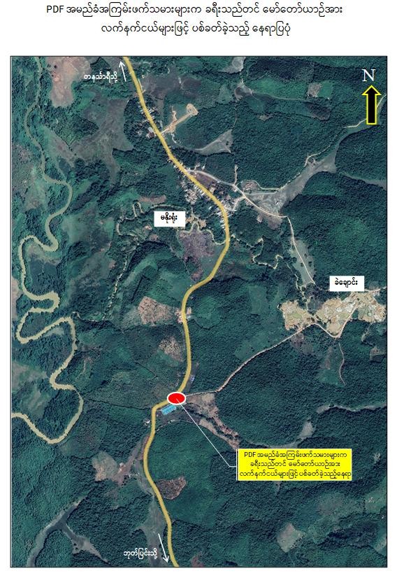 တနင်္သာရီတိုင်းဒေသကြီး၊ ဘုတ်ပြင်းမြို့နယ်အတွင်း NUG ၊ CRPH လက်ဝေခံ PDF အမည်ခံ အကြမ်းဖက်သမားများက ခရီးသည်တင်မော်တော်ယာဉ် ၁ စီးအား လက်နက်ငယ်များဖြင့် အကြောင်းမဲ့ပစ်ခတ်မှုကြောင့် အပြစ်မဲ့ခရီးသွားပြည်သူ ၂ ဦး သေဆုံးခဲ့ကြောင်း သိရှိရသည်။