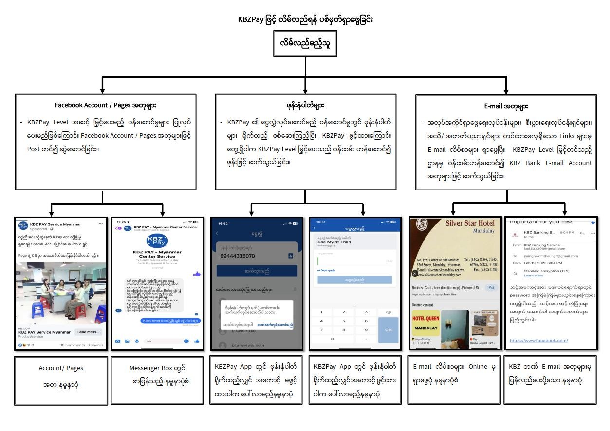 ပြစ်မှုကျူးလွန်သူများကို စစ်ဆေးဖော်ထုတ်ချက်များအရ KBZ Pay Account အား လိမ်လည် မည့်သူသည် Online ပေါ်မှတစ်ဆင့် Facebook Account၊ Facebook Page များတွင် KBZ Pay Level အဆင့်မြှင့်ပေးမည့်အကြောင်းအရာ Post များတင်၍ လိမ်လည်ခံရမည့်သူကို ရှာဖွေခြင်း၊ ဖုန်းနံပါတ် များအား KBZ Pay Application တွင် စစ်ဆေးကြည့်ပါက KBZ Pay Account ဖွင့်ထားခြင်းရှိမရှိ သိနိုင်ပြီး Account ဖွင့်ထားသည့် ဖုန်းနံပါတ်များအား KBZ Bank ၏ KBZ Pay Level မြှင့်ပေးသည့်ဌာနမှ ဝန်ထမ်းပုံစံ အယောင်ဆောင်ဆက်သွယ်ခြင်း၊ KBZ Bank Email Account အတုများဖြင့် KBZ Pay Level မြှင့်ပေးသည့်ဌာနမှ ဝန်ထမ်းပုံစံအယောင်ဆောင် ဆက်သွယ်ခြင်းစသည့် နည်းလမ်းများဖြင့် လိမ်လည်ခံရမည့်သူများကို ရှာဖွေကြပါသည်။