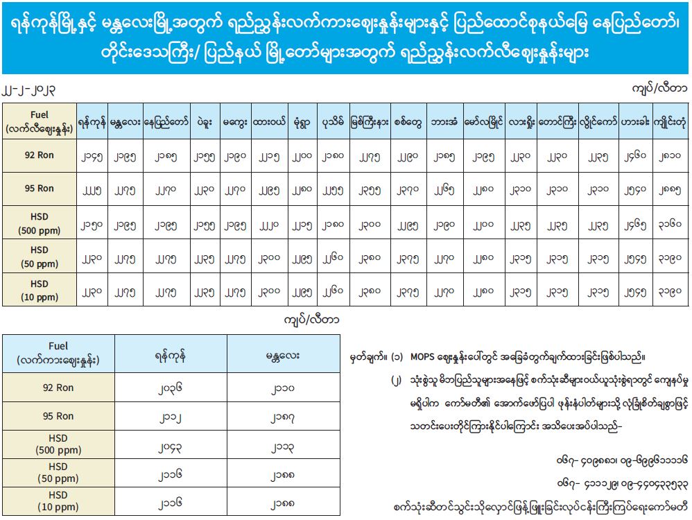 ရန်ကုန်မြို့နှင့် မန္တလေးမြို့အတွက် ရည်ညွှန်းလက်ကားဈေးနှုန်းများနှင့် ပြည်ထောင်စုနယ်မြေ နေပြည်တော်၊ တိုင်းဒေသကြီး/ ပြည်နယ် မြို့တော်များအတွက် ရည်ညွှန်းလက်လီဈေးနှုန်းများ 02/22/2023