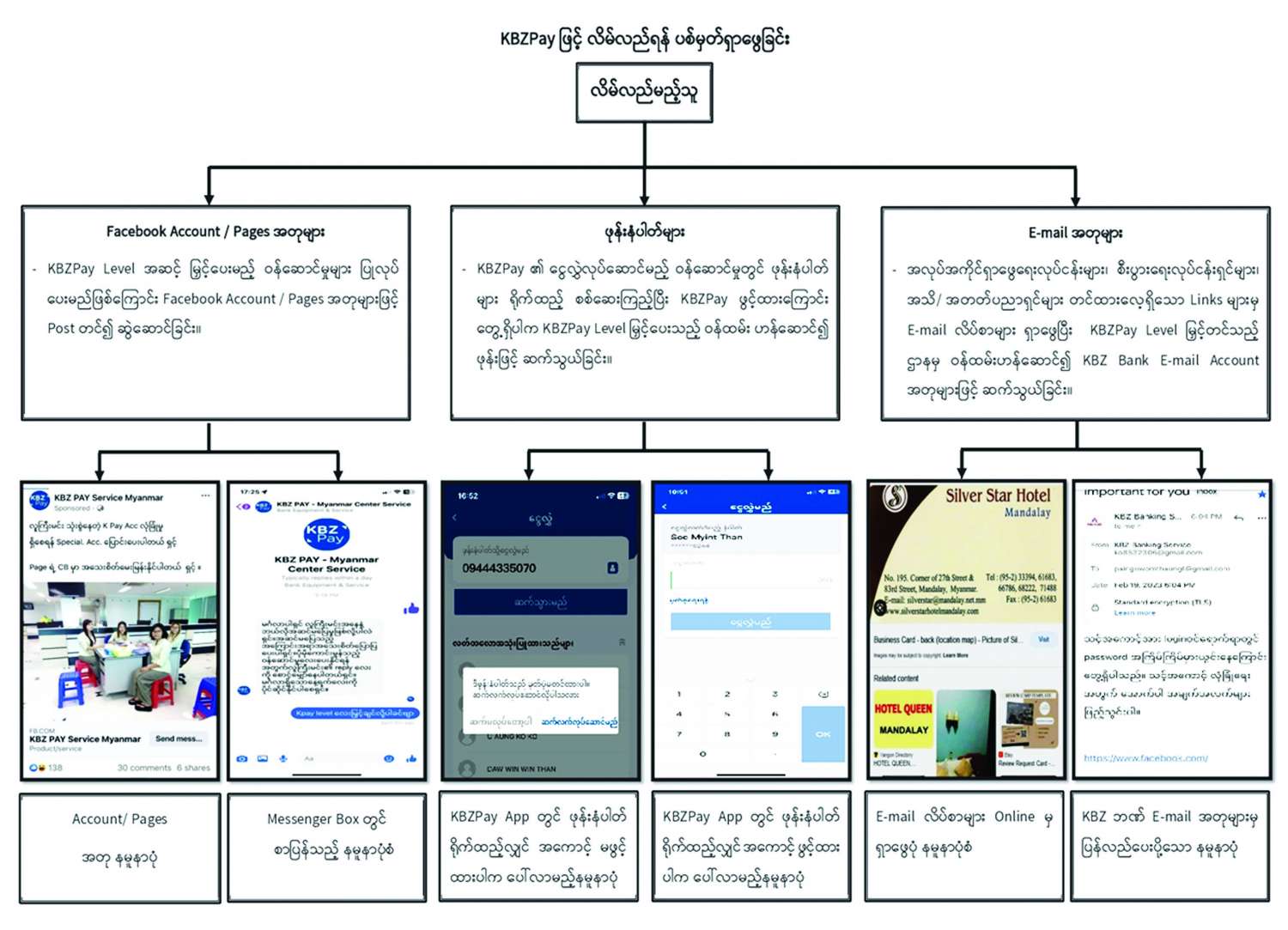 ဇယားများပါ လိမ်လည်မှုကျူးလွန်ပုံ နည်းစနစ်များအရအချို့သော လူပုဂ္ဂိုလ်များအနေဖြင့် မိမိ၏ Email Account၊ ဖုန်းနံပါတ်၊ ကိုယ်ရေးအချက်အလက်များနှင့် လုပ်ငန်းလိပ်စာများကို ဆက်သွယ်မှုလွယ်ကူစေရန်အတွက် လူမှုကွန်ရက် Social Media များနှင့် Facebook တို့တွင် ဖော်ပြထားခြင်း၊ လိပ်စာကတ်များတွင် ဖော်ပြထားခြင်းတို့ကြောင့် ပြစ်မှုကျူးလွန်သူများအနေဖြင့် Email Account များ ကို စောင့်ကြည့်ရယူပြီး ငွေများလိမ်လည်လွှဲပြောင်းထုတ်ယူနိုင်သည့် အခွင့်အလမ်းများ ရရှိခြင်းဖြစ်ကြောင်းနှင့် လိမ်လည်မည့်သူ များသည် KBZ Pay Account များအား မသိနားမလည်သူအချို့ထံမှ ငွေကြေးအနည်းငယ်အသုံးပြု၍ ဝယ်ယူကာ အဆိုပါ Account များဖြင့် ငွေများလွှဲပြောင်းထုတ်ယူရာတွင် ကြားခံအဖြစ်အသုံးပြုကြကြောင်း ဖော်ထုတ်သိရှိရသည်။