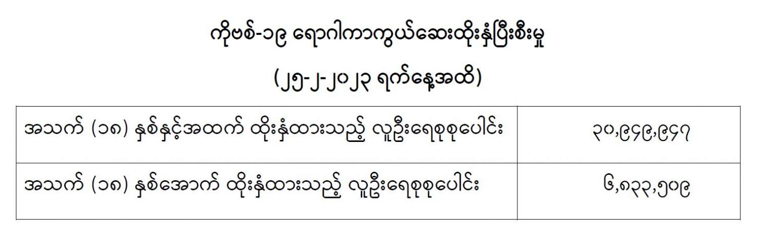 COVID-19 ရောဂါ ကာကွယ်ထိန်းချုပ်ရေးအတွက် တိုင်းဒေသကြီး/ပြည်နယ်များတွင် COVID-19 ရောဂါကာကွယ်ဆေးကို ဦးတည်အုပ်စုများသတ်မှတ်၍ ထိုးနှံပေးလျက်ရှိရာ (၂၅-၂-၂၀၂၃) ရက်နေ့အထိ အသက်(၁၈)နှစ်နှင့်အထက် လူဦးရေစုစုပေါင်း(၃၀,၉၄၉,၉၄၇)ဦးနှင့် အသက်(၁၈)နှစ်အောက် လူဦးရေစုစုပေါင်း (၆,၈၃၃,၅၀၉) ဦးတို့အား ထိုးနှံထားရှိပြီးဖြစ်ပါသည်။