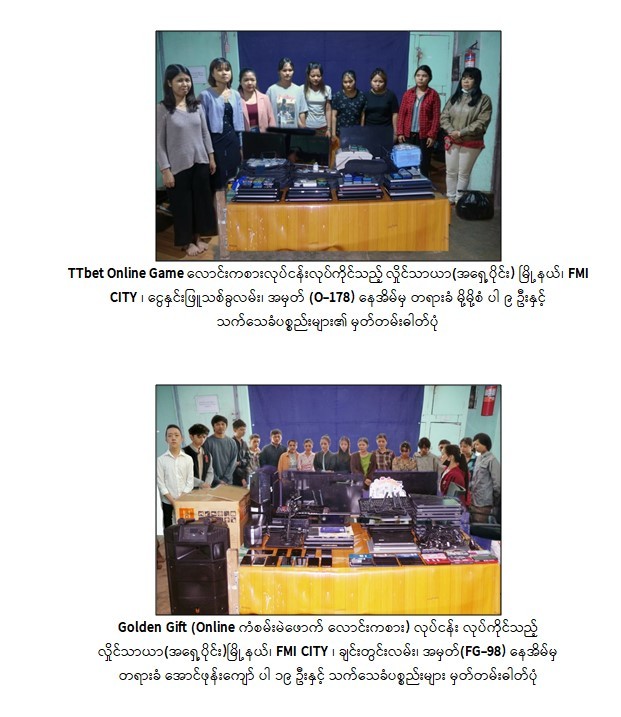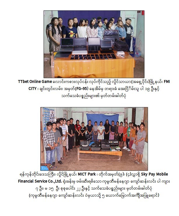 ဖြစ်စဉ်များတွင် Online Game လောင်းကစားလုပ်ငန်း၊ Online ကံစမ်းမဲဖောက် လောင်းကစားလုပ်ငန်းနှင့် တရားမဝင် Online ချေးငွေလုပ်ငန်းလုပ်ကိုင်သည့် အမှုပေါင်း ၅ မှုမှ တရားခံအမျိုးသား ၂၄ ဦး၊ အမျိုးသမီး ၄၇ ဦး၊ စုစုပေါင်း ၇၁ ဦးတို့အား ဖမ်းဆီးရမိခဲ့ကာ လက်တော့ ၁၆၄ လုံး၊ လက်ကိုင်ဖုန်း ၁၄၀ လုံး၊ မော်နီတာ ၇ လုံး၊ ပရင်တာ ၂ လုံး၊ System Box ၁ လုံး၊ UPS ၁ လုံး၊ Desktop ၁ လုံး၊ ဆင်းကတ် ၇၄၁ ကတ်၊ ယာဉ်အမှတ် YGN 6S-8888 Mercedes Benz အနက်ရောင်ယာဉ် ၁ စီးနှင့် ယာဉ်အမှတ် YGN 9B-6667 Lexus အနက်ရောင်ယာဉ် ၁ စီးတို့အား သိမ်းဆည်းရမိခဲ့ပြီး အမှုမှတရားခံများ ပြစ်မှုကျူးလွန်ရာတွင် ဖွင့်လှစ်အသုံးပြုခဲ့သည့် ဘဏ်အကောင့် များနှင့် KBZ Pay ၊ Wave Pay အကောင့်တို့ရှိ ငွေကျပ် ၄၈၀၅ သိန်းခန့်နှင့် KBZ Pay အကောင့် ၁၄ ခုတို့အား ယာယီတားဆီးထိန်းသိမ်းထားရှိကာ အဆိုပါအကောင့်များအတွင်းရှိ ငွေများအားစိစစ်လျက် ရှိပြီး တရားခံများအား တည်ဆဲဥပဒေများနှင့်အညီ ထိရောက်စွာအရေးယူနိုင်ရေး ဆက်လက် ဆောင်ရွက်လျက်ရှိကြောင်း သတင်းရရှိသည်။