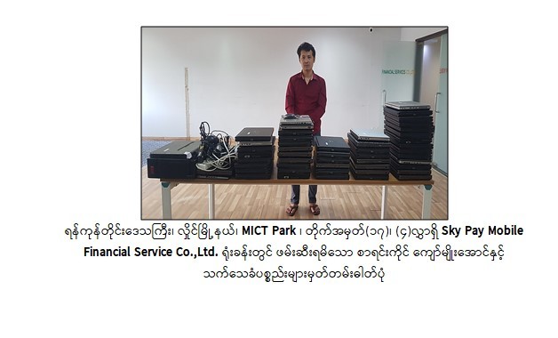 ဖေဖော်ဝါရီလ ၅ ရက်နေ့ မွန်းလွဲ ၁၂ နာရီ ၃၅ မိနစ်အချိန်တွင် လှိုင်မြို့နယ်၊ MICT Park ၊ တိုက်အမှတ်(၁၇)၊ (၄)လွှာရှိ Sky Pay Mobile Financial Services Co.,Ltd. ရုံးခန်းတွင် Money Bag Application ၊ Cash Now Application ၊ Cola Kyat Application ၊ U Loan Application တို့အား အသုံးပြုပြီး တရားမဝင် Online ချေးငွေလုပ်ငန်းလုပ်ကိုင်နေသည့် စာရင်းကိုင်ဖြစ်သူ ကျော်မျိုးအောင်အား လက်တော့ ၄၉ လုံး၊ ပရင်တာ ၁ လုံး၊ ဆက်စပ်ပစ္စည်းများဖြင့်လည်းကောင်း အသီးသီးဖမ်းဆီးရမိခဲ့သည်။