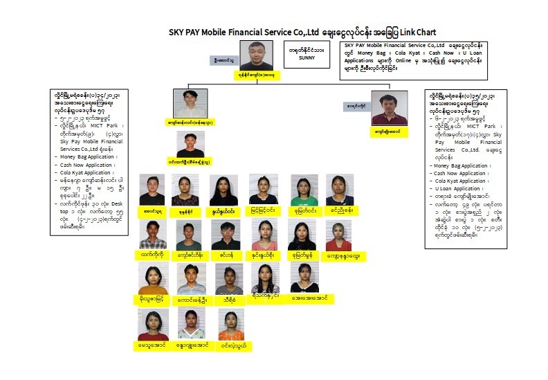 ဖမ်းဆီးရမိသည့် တရားခံ ရန်နိုင်ကျော်(ခ)အားဖု၏ ထွက်ဆိုချက်အရ ဖေဖော်ဝါရီလ ၄ ရက်နေ့ မွန်းလွဲ ၃ နာရီခွဲအချိန်တွင် ရန်ကုန်တိုင်းဒေသကြီး၊ လှိုင်မြို့နယ်၊ MICT Park၊ တိုက်အမှတ် (၉)၊ (၄)လွှာရှိ Sky Pay Mobile Financial Services Co.,Ltd. ရုံးခန်းသို့ ဝင်ရောက်ရှာဖွေရာ Money Bag Application ၊ Cash Now Application ၊ Cola Kyat Application တို့အား အသုံးပြုပြီး တရားမဝင် Online ချေးငွေလုပ်ငန်းလုပ်ကိုင်နေသည့် မန်နေဂျာကျော်ဆန်းလင်း(ခ)အားချန်ပါ ၂၂ ဦးတို့အား လက်ကိုင်ဖုန်း ၃၀ လုံး၊ လက်တော့ ၅၅ လုံး၊ Desktop ၁ လုံးနှင့် ဆက်စပ်ပစ္စည်းများဖြင့်လည်းကောင်း၊