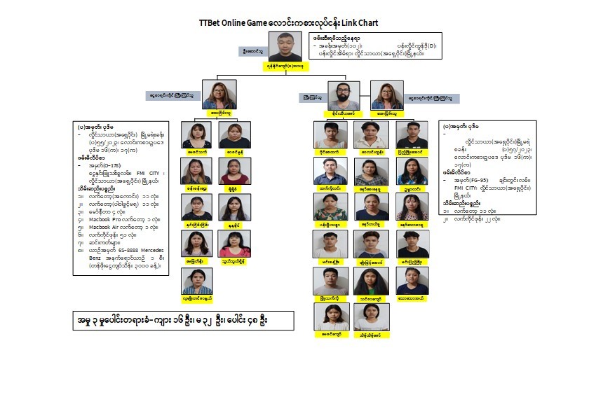 သတင်းဆက်ဖော်ထုတ်ချက်အရ လှိုင်သာယာ(အရှေ့ပိုင်း)မြို့နယ်၊ FMI CITY ၊ ချင်းတွင်းလမ်းရှိ အိမ်အမှတ်(FG-95)ကို ထပ်မံဝင်ရောက်ရှာဖွေရာ TTbet Online Game လောင်းကစားလုပ်ငန်းအား ကြီးကြပ်/စာရင်းကိုင်အဖြစ်လုပ်ကိုင်သူ အေးငြိမ်းသူနှင့် ကြီးကြပ်လုပ်ကိုင်သူ စိုင်းသီဟဇော်ပါ တရားခံ ၁၉ ဦးတို့အား လက်တော့ ၁၁ လုံး၊ လက်ကိုင်ဖုန်း ၂၂ လုံး၊ ဆက်စပ်ပစ္စည်းများနှင့်အတူ ဖမ်းဆီးရမိခဲ့သည်။