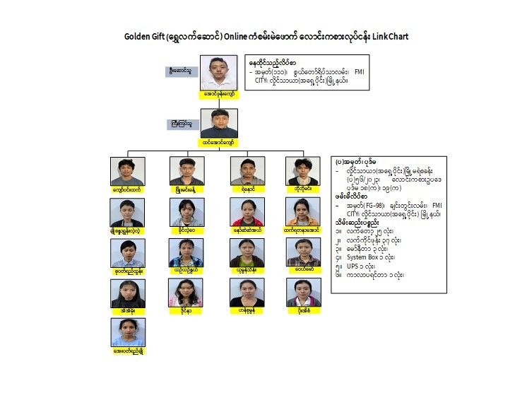 ဖမ်းဆီးရမိသူများ၏ ထွက်ဆိုချက်အရ လှိုင်သာယာ(အရှေ့ပိုင်း)မြို့နယ်၊ FMI CITY၊ ချင်းတွင်းလမ်းရှိ အိမ်အမှတ်(FG-98)ကို ထပ်မံဝင်ရောက်ရှာဖွေရာ Golden Gift (Online ကံစမ်း မဲဖောက်လောင်းကစားလုပ်ငန်း)အား စီမံခန့်ခွဲလုပ်ကိုင်သူ အောင်ဖုန်းကျော်နှင့် ကြီးကြပ်လုပ်ကိုင်သူ ထင်အောင်ကျော်(ခ)အယ်လစ်ပါ တရားခံ ၁၉ ဦးတို့အား လက်ကိုင်ဖုန်း ၃၇ လုံး၊ လက်တော့ ၂၅ လုံး၊ မော်နီတာ ၃ လုံး၊ System Box ၁ လုံး၊ UPS ၁ လုံး၊ ကာလာပရင်တာ ၁ လုံး၊ ဆက်စပ်ပစ္စည်း များနှင့်အတူ ထပ်မံဖမ်းဆီးရမိခဲ့သည်။