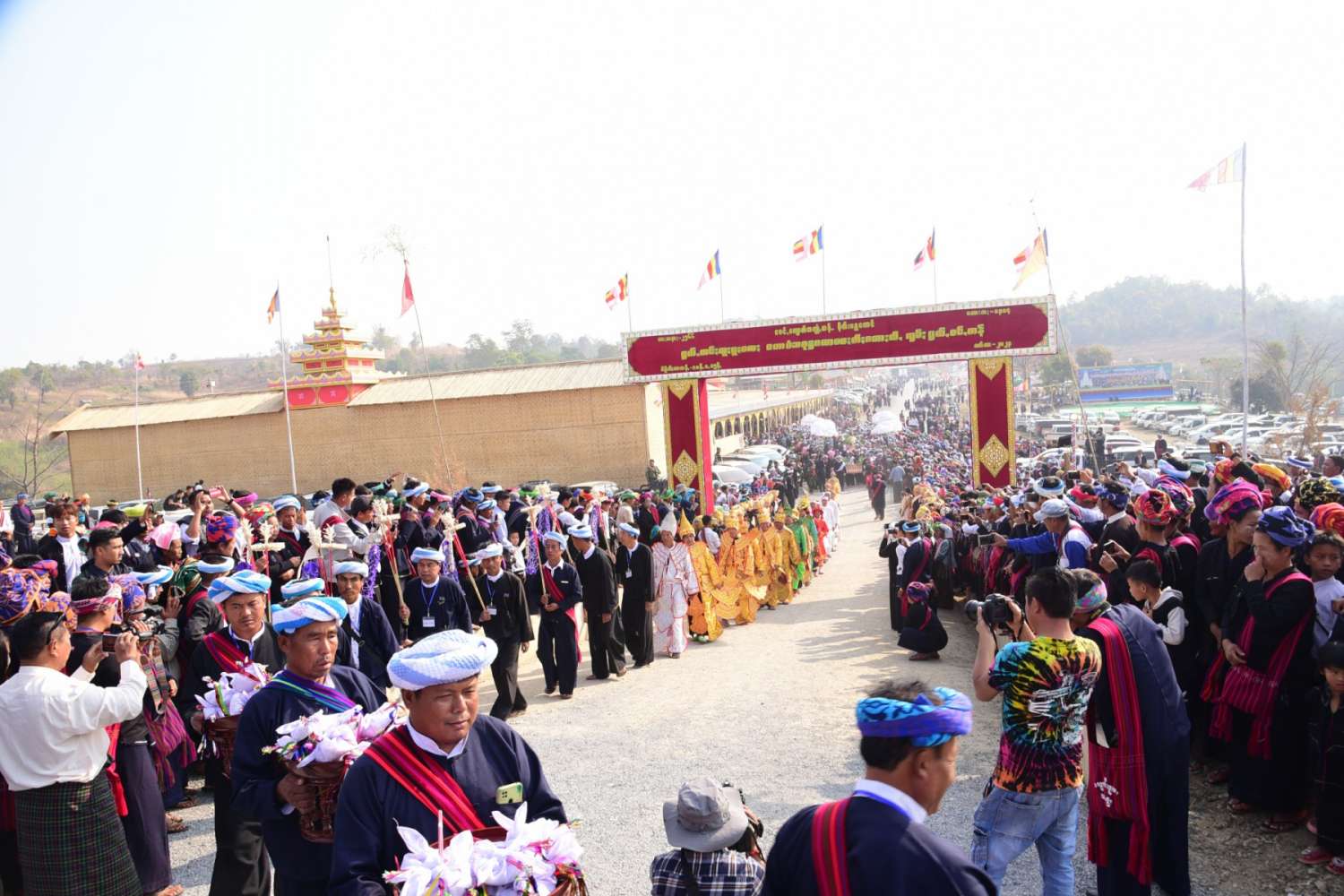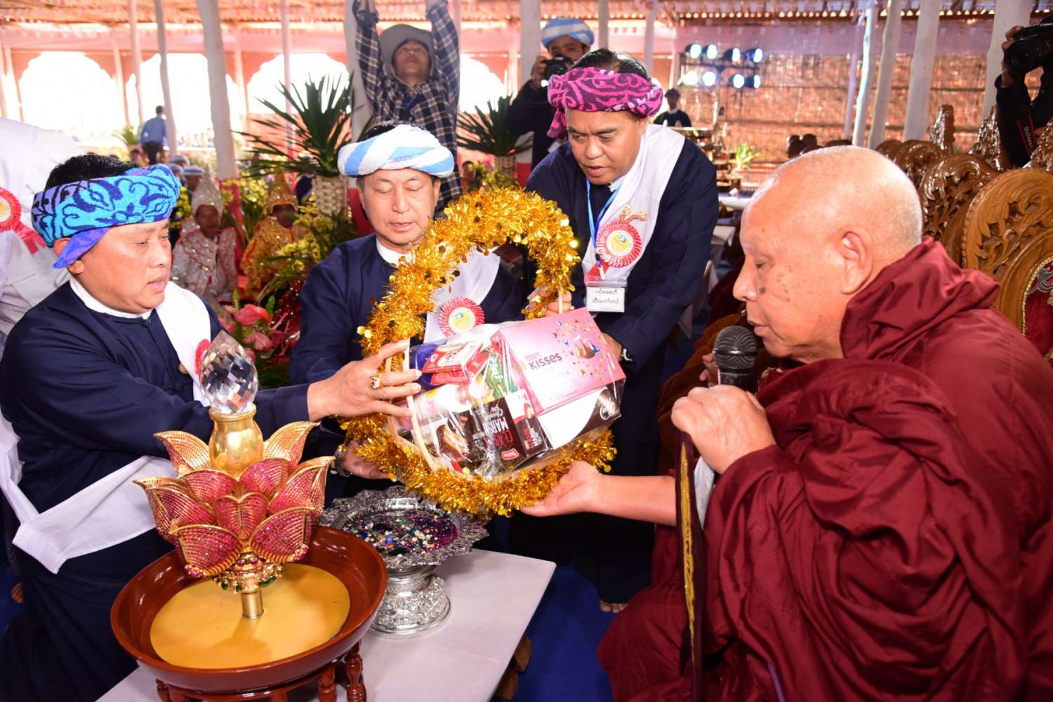 အခမ်းအနားကို ဆရာတော်၊ သံဃာတော်များနှင့် နိုင်ငံတော်စီမံအုပ်ချုပ်ရေးကောင်စီအဖွဲ့ဝင် ဦးခွန်စံလွင်၊ ရှမ်းပြည်နယ်ဝန်ကြီးချုပ် ဦးအောင်ဇော်အေး အမှူးပြုသော ဧည့်ပရိတ်သတ်တို့က "နမောတဿ" သုံးကြိမ်ရွတ်ဆို ဘုရားကန်တော့ဖွင့်လှစ်ပြီး ပအိုဝ်းအမျိုးသားခေါင်းဆောင် ဦးအောင်ခမ်းထီက သမ္မာဒေဝနတ်ဗြဟ္မာများအား ပင့်ဖိတ်သည်။