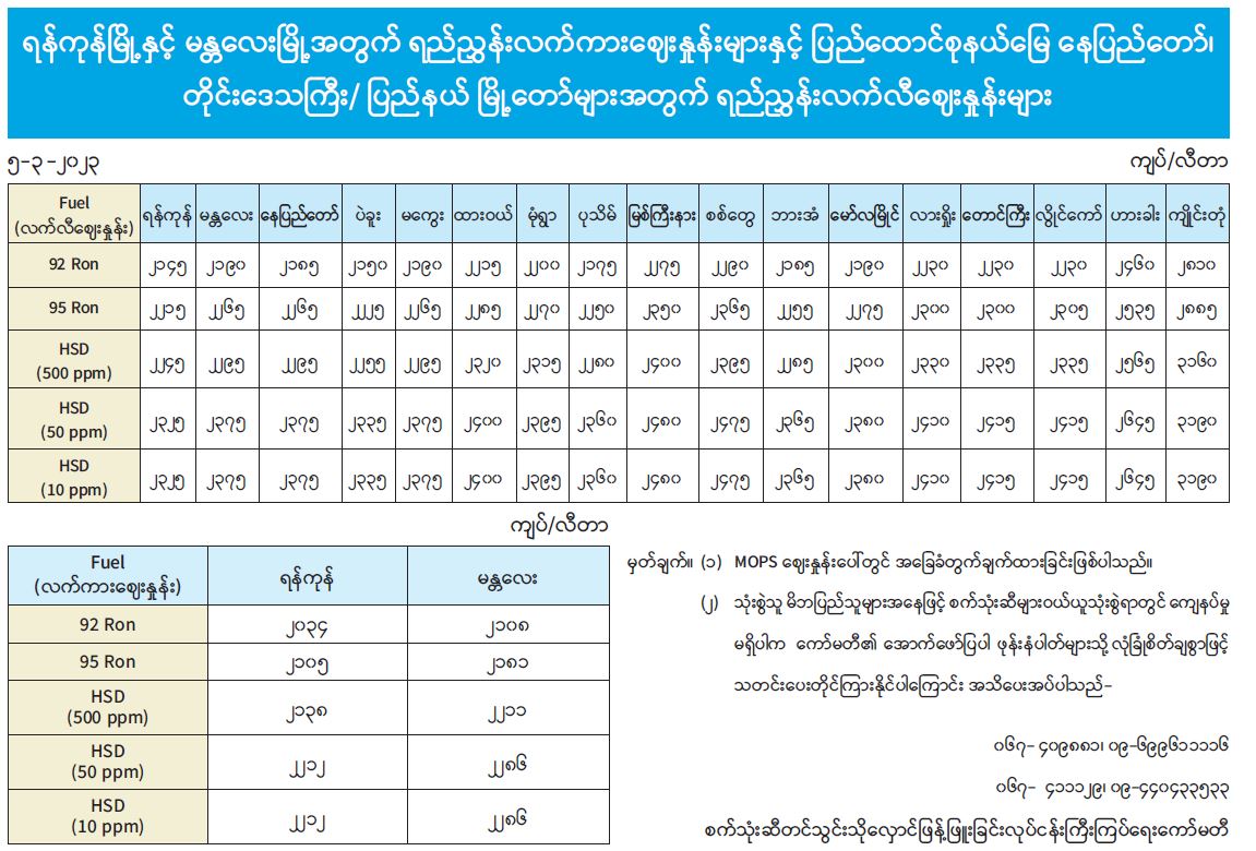 ရန်ကုန်မြို့နှင့် မန္တလေးမြို့အတွက် ရည်ညွှန်းလက်ကားဈေးနှုန်းများနှင့် ပြည်ထောင်စုနယ်မြေ နေပြည်တော်၊ တိုင်းဒေသကြီး/ ပြည်နယ် မြို့တော်များအတွက် ရည်ညွှန်းလက်လီဈေးနှုန်းများ 03/05/2023
