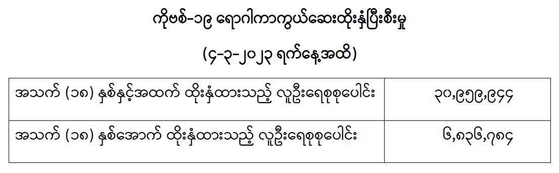 COVID-19 ရောဂါ ကာကွယ်ထိန်းချုပ်ရေးအတွက် တိုင်းဒေသကြီး/ပြည်နယ်များတွင် COVID -19 ရောဂါကာကွယ်ဆေးကို ဦးတည်အုပ်စုများသတ်မှတ်၍ ထိုးနှံပေးလျက်ရှိရာ (၄-၃-၂၀၂၃) ရက်နေ့အထိ အသက် (၁၈) နှစ်နှင့်အထက် လူဦးရေစုစုပေါင်း (30,959,944) ဦးနှင့် အသက် (၁၈) နှစ်အောက် လူဦးရေစုစုပေါင်း (6,836,784) ဦးတို့အား ထိုးနှံထားရှိပြီး ဖြစ်ပါသည်။