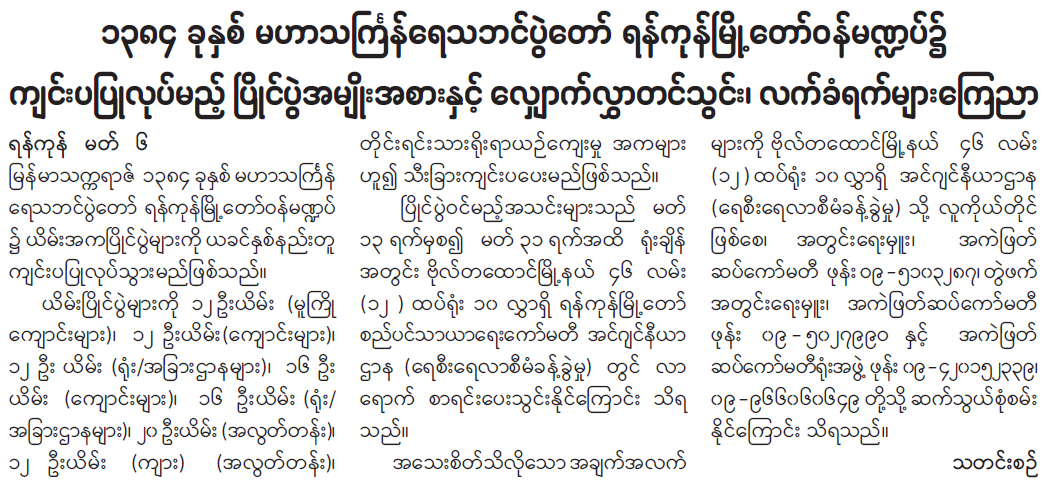 ၁၃၈၄ ခုနှစ် မဟာသင်္ကြန်ရေသဘင်ပွဲတော် ရန်ကုန်မြို့တော်ဝန်မဏ္ဍပ်၌ ကျင်းပပြုလုပ်မည့် ပြိုင်ပွဲအမျိုးအစားနှင့် လျှောက်လွှာတင်သွင်း၊ လက်ခံရက်များကြေညာ 03/07/2023
