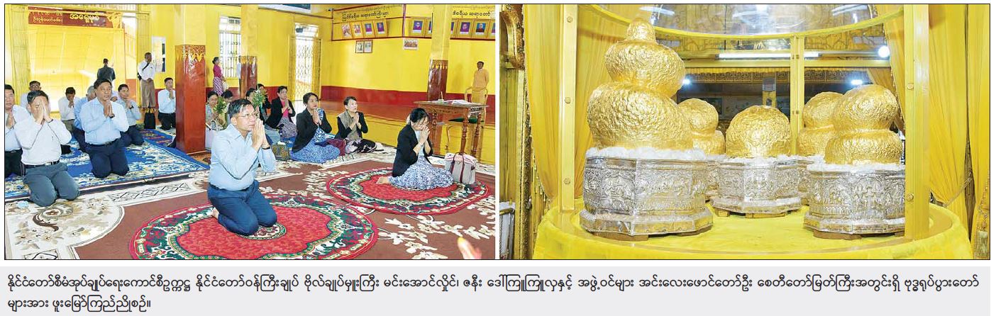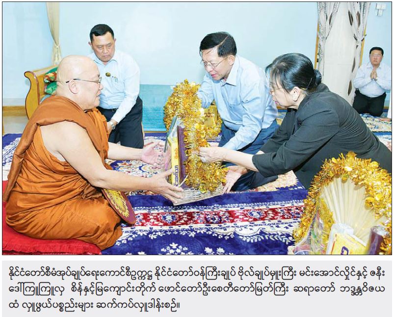 ထို့နောက် နိုင်ငံတော်စီမံအုပ်ချုပ်ရေးကောင်စီဥက္ကဋ္ဌ နိုင်ငံတော်ဝန်ကြီးချုပ်နှင့် အဖွဲ့ဝင်များသည် စေတီတော်မြတ်ကြီးပရိဝုဏ်တော်အတွင်းရှိ စိန်နှင့်မြ ကျောင်းတိုက်အတွင်း၌ ဖောင်တော်ဦး စေတီတော်မြတ်ကြီးဆရာတော် ဘဒ္ဒန္တဝိဇယအား ဖူးမြော်ကြည်ညိုပြီး လှူဖွယ်ပစ္စည်းများနှင့် နဝကမ္မအလှူငွေများ ဆက်ကပ်လှူဒါန်းသည်။ ထို့နောက် ဆရာတော်ကြီး၏ ကျန်းမာရေးဆိုင်ရာများနှင့် အင်းလေးဒေသနှင့် စေတီတော်မြတ်ကြီး ရေရှည်တည်တံ့ခိုင်မြဲရေးအတွက် လိုအပ်သည်များကို လျှောက်ထားခဲ့ပြီး ဆရာတော်ကြီးထံမှ ဩဝါဒကို နာယူသည်။