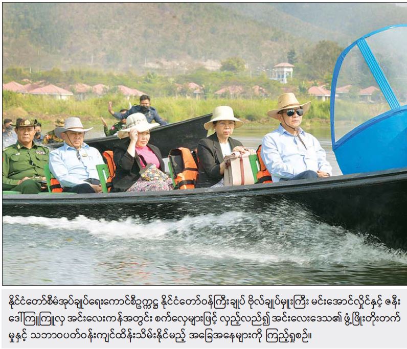 ဆက်လက်ပြီး နိုင်ငံတော်စီမံအုပ်ချုပ်ရေးကောင်စီဥက္ကဋ္ဌ နိုင်ငံတော်ဝန်ကြီးချုပ်နှင့် အဖွဲ့ဝင်များသည် အင်းလေးကန်အတွင်း စက်လှေများဖြင့် လှည့်လည်၍ အင်းလေးဒေသ၏ ဖွံ့ဖြိုးတိုးတက်မှုနှင့် သဘာဝပတ်ဝန်းကျင်ထိန်းသိမ်းနိုင်မည့် အခြေအနေများကို လှည့်လည်ကြည့်ရှုခဲ့ကြကြောင်း သတင်းရရှိသည်။