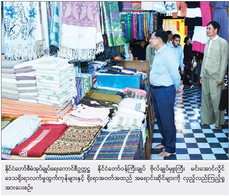 ယင်းနောက် ဒေသရိုးရာလက်မှုထွက်ကုန်များနှင့် ရိုးရာအဝတ်အထည် အရောင်းဆိုင်များအတွင်းသို့ လှည့်လည်ကြည့်ရှုအားပေးပြီး အင်းလေးဒေသမှ ထွက်ရှိသည့် ထွက်ကုန်ပစ္စည်းများအား ယခုထက် အရည်အသွေးပိုမိုကောင်းမွန်စွာ ထုတ်လုပ်ရောင်းချနိုင်ရေးအတွက် လိုအပ်သည့် နည်းပညာနှင့် အကူအညီများပေးအပ်သွားရန်၊ ဒေသတစ်ခုထုတ်ကုန်တစ်ခု One Village One Product ဖြစ်စေရေး စီမံဆောင်ရွက်ပေးရန်နှင့် လာမည့်နွေရာသီ ကျောင်းပိတ်ရက်များအတွင်း အင်းလေးဒေသသို့ ပြည်တွင်းပြည်ပမှ ဘုရားဖူးဧည့်သည်များ စိတ်ချမ်းမြေ့စွာ လာရောက်နိုင်ရေး တာဝန်ရှိသူများကို မှာကြားသည်။