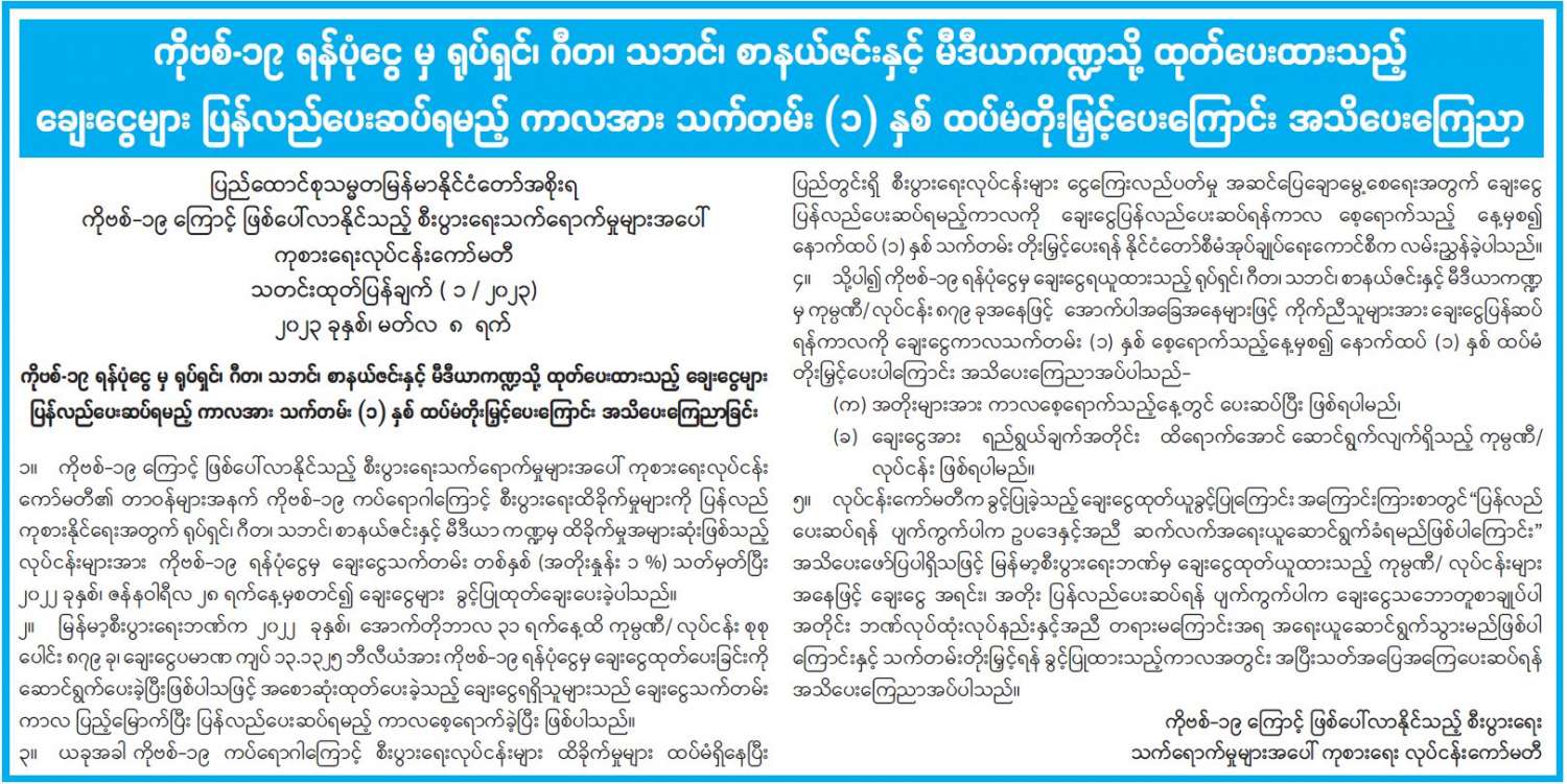 ကိုဗစ်-၁၉ ရန်ပုံငွေ မှ ရုပ်ရှင်၊ ဂီတ၊ သဘင်၊ စာနယ်ဇင်းနှင့် မီဒီယာကဏ္ဍသို့ ထုတ်ပေးထားသည့် ချေးငွေများ ပြန်လည်ပေးဆပ်ရမည့် ကာလအား သက်တမ်း (၁) နှစ် ထပ်မံတိုးမြှင့်ပေးကြောင်း အသိပေးကြေညာ 03/09/2023