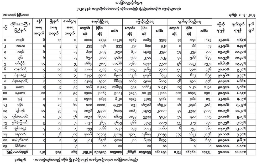 ယခုနှစ်တွင် နိုင်ငံခြားစာစစ်ဌာန ငါးခုနှင့် ပြည်တွင်း၌ စာစစ်ဌာန ၈၅၈ ခု စာစစ်ဌာန စုစုပေါင်း ၈၆၃ခု ဖွင့်လှစ်ဖြေဆိုခဲ့ရာ စာမေးပွဲဖြေဆိုရန် စာရင်းပေးသွင်းသူဦးရေ စုစုပေါင်း ၁၇၉၈၄၃ ဦးရှိပြီး စာမေးပွဲပထမနေ့ မြန်မာစာဘာသာရပ် လာရောက်ဖြေဆိုသူ စုစုပေါင်း ၁၆၁၈၅၁ ဦးရှိကာ ဖြေဆိုသူရာခိုင်နှုန်းအနေဖြင့် ၉၀ ရာခိုင်နှုန်းရှိကြောင်း ပညာရေးဝန်ကြီးဌာနမှ သိရသည်။