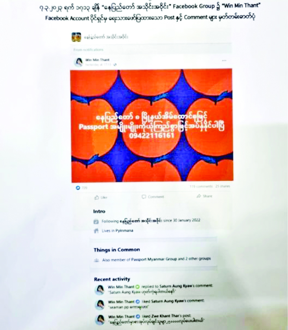 ၂၀၂၃ ခုနှစ် မတ် ၇ ရက်တွင် “နေပြည်တော်အသိုင်းအဝိုင်း” Facebook Group “Win Min Thant” Facebook Account ပိုင်ရှင်က “နေပြည်တော် ၈ မြို့နယ် အိမ်ထောင်စုဖြင့် ပတ်စပို့အမျိုးမျိုးကို ယုံကြည်စွာဖြင့်အပ်နှံနိုင်ပါပြီ၊ ဆက်သွယ်ရန်ဖုန်းနံပါတ် 09-422116161” ဟု ရေးသားဖော်ပြထားခဲ့မှုနှင့် ပတ်သက်၍ လုံခြုံရေးတပ်ဖွဲ့ဝင်များက ဥပဒေနှင့်အညီ ဖော်ထုတ်အရေးယူနိုင်ရေး စုံစမ်းစစ်ဆေးမှုများ ဆောင်ရွက်ခဲ့သည်။