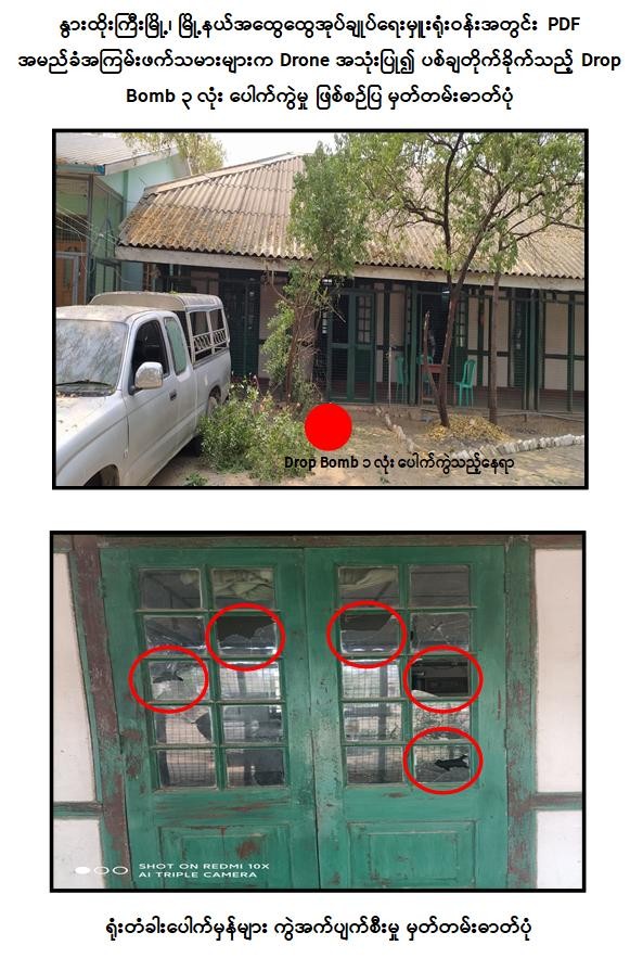 အလားတူ နွားထိုးကြီးမြို့၊ အမှတ်(၁)ရပ်ကွက်ရှိ မြို့နယ်အထွေထွေအုပ်ချုပ်ရေးမှူးရုံးအား နံနက် ၁၁ နာရီ ၁၅ မိနစ်ခန့်တွင် PDF အမည်ခံအကြမ်းဖက်သမားများက အဆိုပါရုံး၏ အနောက်တောင်ဘက်မှ Drone ယာဉ် ၁ စင်းဖြင့် Drop Bomb ၃ လုံး ပစ်ချတိုက်ခိုက်ခဲ့ရာ ရုံးဝန်းအတွင်း ကျရောက်ပေါက်ကွဲခဲ့ပြီး ရုံးဝန်ထမ်း အမျိုးသား ၁ ဦးသေဆုံးပြီး အမျိုးသား ၂ ဦး ဗုံးစထိမှန်ဒဏ်ရာများရရှိကာ ရုံးတံခါးပေါက်မှန် ၈ ချပ် ကွဲအက်ပျက်စီးသွားကြောင်း သိရှိရသည်။