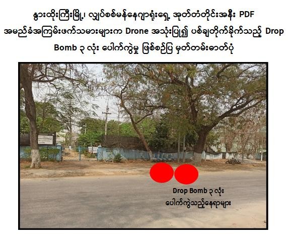 မန္တလေးတိုင်းဒေသကြီး၊ နွားထိုးကြီးမြို့၊ အမှတ်(၄)ရပ်ကွက်ရှိ မြို့နယ်လျှပ်စစ်မန်နေဂျာရုံးနှင့် အမှတ်(၁)ရပ်ကွက်ရှိ မြို့နယ်အထွေထွေအုပ်ချုပ်ရေးမှူးရုံးတို့အား PDF အမည်ခံ အကြမ်းဖက်သမားများက Drone ယာဉ်များအသုံးပြု၍ Drop Bomb များ ပစ်ချတိုက်ခိုက်ခဲ့သဖြင့် ရုံးဝန်ထမ်းအမျိုးသား ၁ ဦးသေဆုံးပြီး အမျိုးသား ၃ ဦး ဒဏ်ရာရရှိခဲ့ကြောင်း သိရှိရသည်။