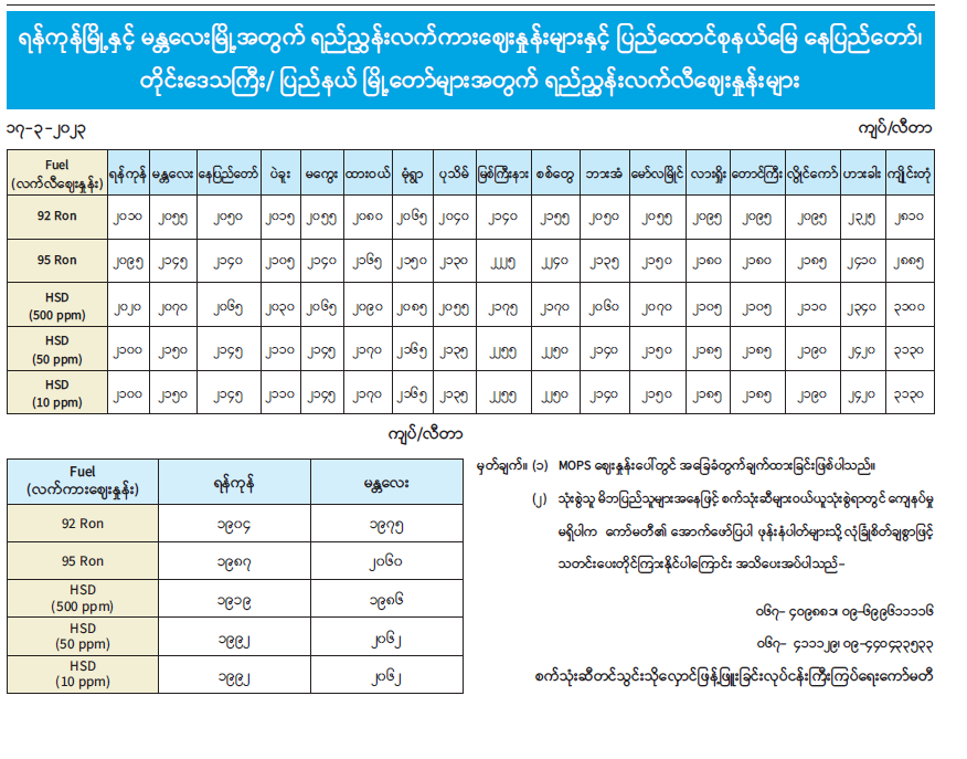 ရန်ကုန်မြို့နှင့်မန္တလေးမြို့အတွက် ရည်ညွှန်းလက်ကားဈေးနှုန်းများနှင့် ပြည်ထောင်စုနယ်မြေ နေပြည်တော်၊ တိုင်းဒေသကြီး/ပြည်နယ် မြို့တော်များအတွက် ရည်ညွှန်းလက်လီ ဈေးနှုန်းများ 03/17/2023