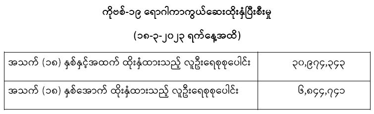 COVID-19 ရောဂါ ကာကွယ်ထိန်းချုပ်ရေးအတွက် တိုင်းဒေသကြီး/ပြည်နယ်များတွင် COVID -19 ရောဂါကာကွယ်ဆေးကို ဦးတည်အုပ်စုများသတ်မှတ်၍ ထိုးနှံပေးလျက်ရှိရာ (၁၈-၃-၂၀၂၃) ရက်နေ့အထိ အသက်(၁၈)နှစ်နှင့်အထက် လူဦးရေစုစုပေါင်း (၃၀,၉၇၄,၃၄၃) ဦးနှင့် အသက် (၁၈) နှစ်အောက် လူဦးရေစုစုပေါင်း (၆,၈၄၄,၇၄၁) ဦးတို့အား ထိုးနှံထားရှိပြီး ဖြစ်ပါသည်။