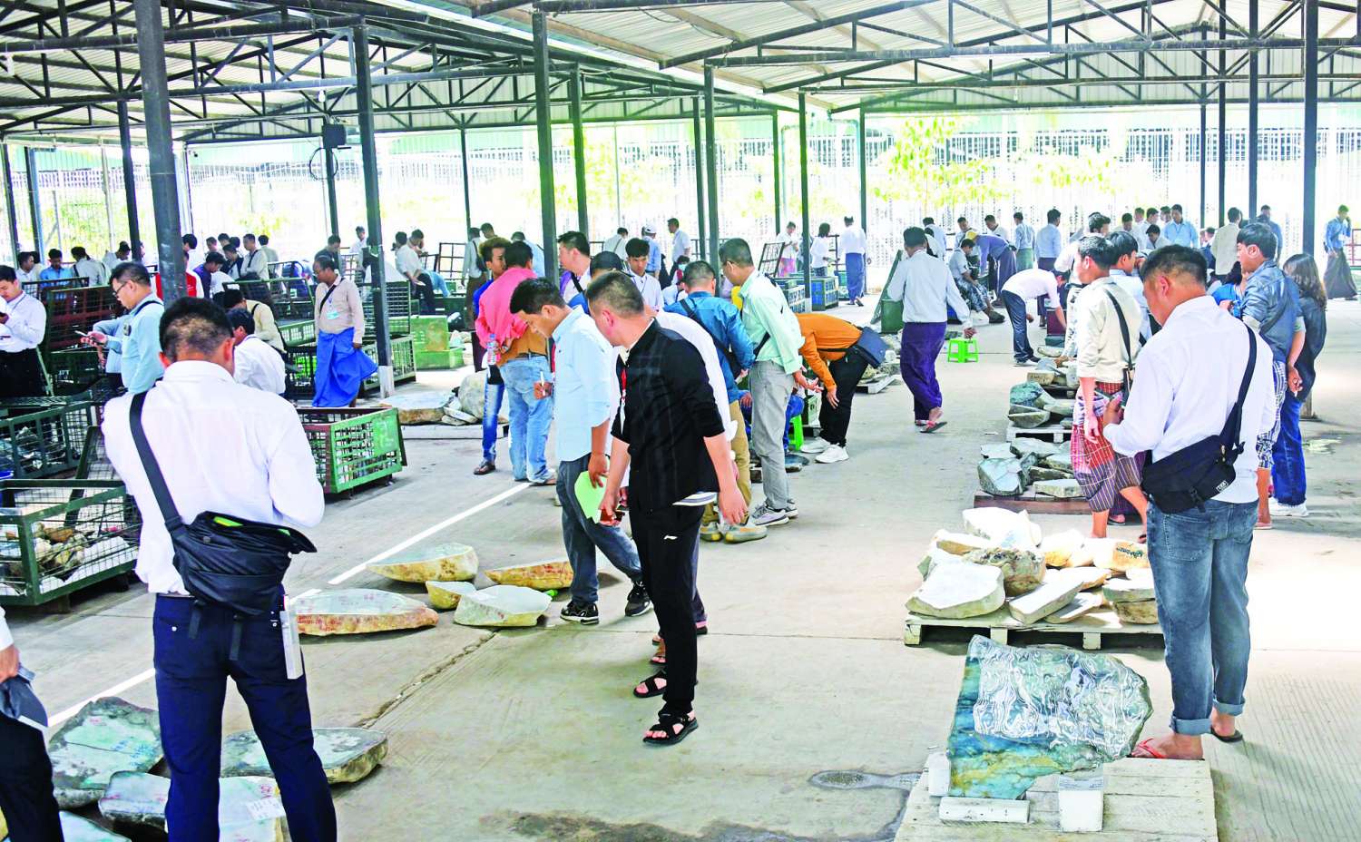 ပြပွဲဆဋ္ဌမနေ့တွင် ရောင်းချမည့် ကျောက်စိမ်းအတွဲပေါင်း အတွဲ ၂၁၅၀အနက် ကျောက်စိမ်းအတွဲအမှတ် (၇၅၁) မှ (၁၅၀၀) အထိကို ပြည်တွင်း၊ ပြည်ပရတနာကုန်သည်များက ကြည့်ရှုစစ်ဆေးကြပြီး ဈေးနှုန်းတင်သွင်းလွှာများကို တင်ဒါပုံးများအတွင်းသို့ ထည့်သွင်းကြသည်။