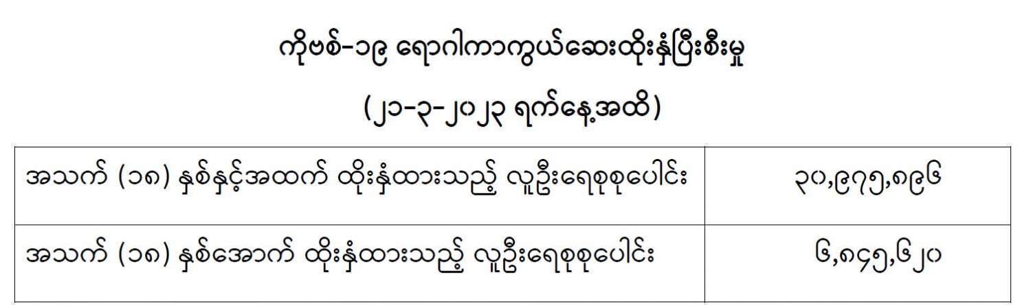 COVID-19 ရောဂါ ကာကွယ်ထိန်းချုပ်ရေးအတွက် တိုင်းဒေသကြီး/ပြည်နယ်များတွင် COVID -19 ရောဂါကာကွယ်ဆေးကို ဦးတည်အုပ်စုများသတ်မှတ်၍ ထိုးနှံပေးလျက်ရှိရာ (၂၁-၃-၂၀၂၃) ရက်နေ့အထိ အသက် (၁၈) နှစ်နှင့်အထက် လူဦးရေစုစုပေါင်း (30,97၅,၈၉၆) ဦးနှင့် အသက် (၁၈) နှစ်အောက် လူဦးရေစုစုပေါင်း (6,84၅,၆၂၀) ဦးတို့အား ထိုးနှံထားရှိပြီး ဖြစ်ပါသည်။