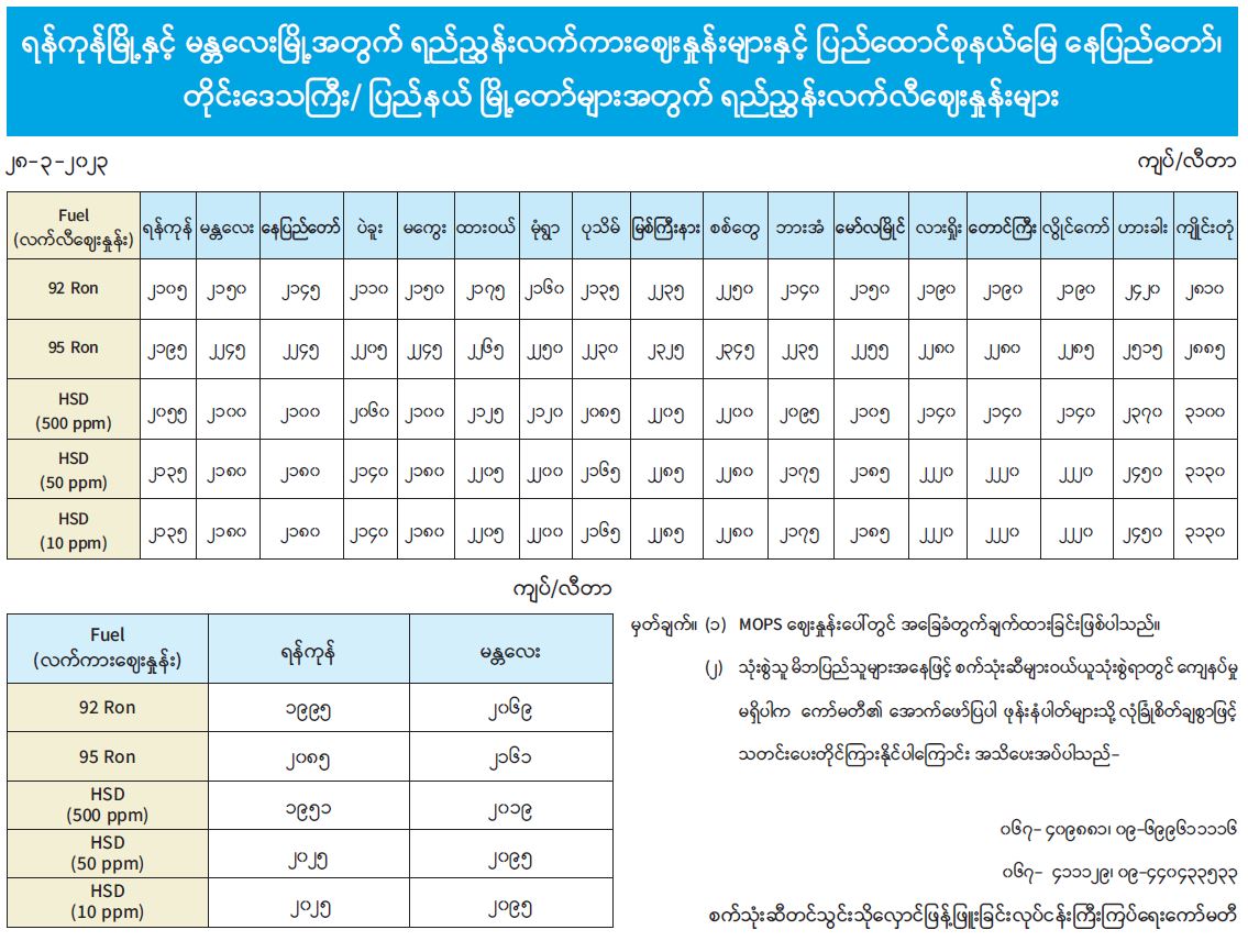 ရန်ကုန်မြို့နှင့် မန္တလေးမြို့အတွက် ရည်ညွှန်းလက်ကားဈေးနှုန်းများနှင့် ပြည်ထောင်စုနယ်မြေ နေပြည်တော်၊ တိုင်းဒေသကြီး/ ပြည်နယ် မြို့တော်များအတွက် ရည်ညွှန်းလက်လီဈေးနှုန်းများ 03/28/2023