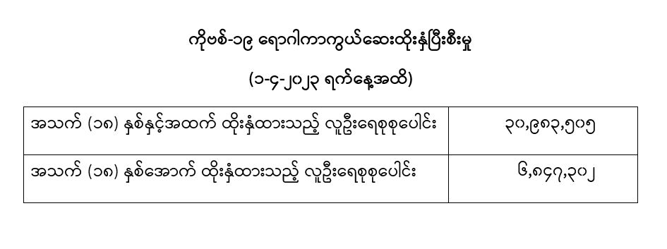 COVID-19 ရောဂါ ကာကွယ်ထိန်းချုပ်ရေးအတွက် တိုင်းဒေသကြီး/ပြည်နယ်များတွင် COVID -19 ရောဂါကာကွယ်ဆေးကို ဦးတည်အုပ်စုများသတ်မှတ်၍ ထိုးနှံပေးလျက်ရှိရာ (၁-၄-၂၀၂၃) ရက်နေ့အထိ အသက် (၁၈) နှစ်နှင့်အထက် လူဦးရေစုစုပေါင်း (၃၀,၉၈၃,၅၀၅) ဦးနှင့် အသက် (၁၈) နှစ်အောက် လူဦးရေစုစုပေါင်း (၆,၈၄၇,၃၀၂) ဦးတို့အား ထိုးနှံထားရှိပြီး ဖြစ်ပါသည်။