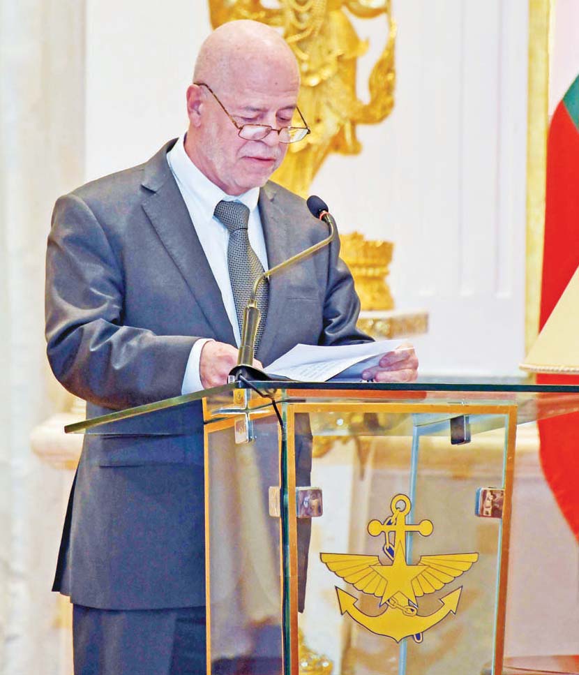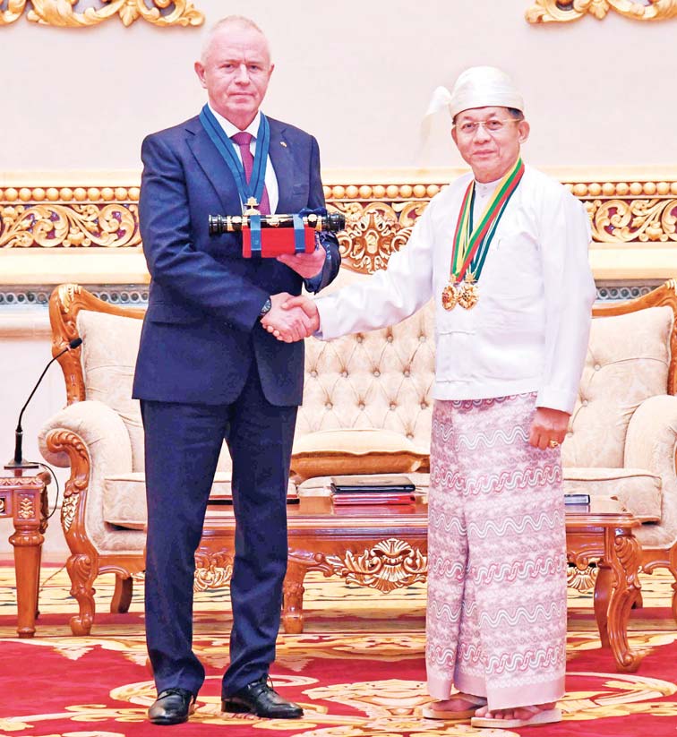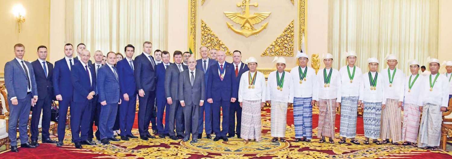 ယနေ့တွင်လည်း ဂုဏ်ထူးဆောင်တံဆိပ်နှင့် အဆောင်အယောင်များ ချီးမြှင့်ခြင်းကို နေပြည်တော်ရှိ ဇေယျာသီရိဗိမာန်ဧည့်ခန်းမဆောင်၌ပြုလုပ်ရာ အခမ်းအနားသို့ နိုင်ငံတော်စီမံအုပ်ချုပ်ရေးကောင်စီဥက္ကဋ္ဌ နိုင်ငံတော်ဝန်ကြီးချုပ် ဗိုလ်ချုပ်မှူးကြီး သတိုးမဟာသရေစည်သူ သတိုးသီရိသုဓမ္မ မင်းအောင်လှိုင်၊ ကောင်စီတွဲဖက်အတွင်းရေးမှူး ဒုတိယဗိုလ်ချုပ်ကြီး ဇေယျကျော်ထင် စည်သူ ရဲဝင်းဦး၊ ကာကွယ်ရေးဦးစီးချုပ် (ရေ) ဗိုလ်ချုပ်ကြီး ဇေယျကျော်ထင် စည်သူ မိုးအောင်၊ ကာကွယ်ရေးဦးစီးချုပ်(လေ) ဗိုလ်ချုပ်ကြီး ဇေယျကျော်ထင် စည်သူ ထွန်းအောင်၊ ကာကွယ်ရေးဦးစီးချုပ်ရုံးမှ တပ်မတော်အရာရှိကြီးများနှင့် တာဝန်ရှိသူများ၊ ရုရှားဖက်ဒရေးရှင်းနိုင်ငံ၊ ကာကွယ်ရေးဝန်ကြီးဌာန၊ ဒုတိယဝန်ကြီး Colonel General Alexander Vasilievich Fomini မြန်မာနိုင်ငံဆိုင်ရာ ရုရှားဖက်ဒရေးရှင်းနိုင်ငံသံအမတ်ကြီး Mr. Nikolay LISTOPADOV၊ စစ်သံမှူး Colonel Sergey KURCHENKO၊ ရုရှားသိပ္ပံအကယ်ဒမီ၊ အရှေ့တိုင်း လေ့လာရေးအင်စတီကျူ့၏ President ဖြစ်သူ Dr. Professor Vitaly Vyacheslavovich NAUMKIN နှင့် တာဝန်ရှိသူများတက်ရောက်ကြသည်။