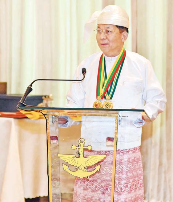 ထို့နောက် နိုင်ငံတော်စီမံအုပ်ချုပ်ရေးကောင်စီဥက္ကဋ္ဌ နိုင်ငံတော်ဝန်ကြီးချုပ်က စွမ်းဆောင်မှုဆိုင်ရာ ဘွဲ့တံဆိပ်ရရှိခဲ့သည့် ရုရှားဖက်ဒရေးရှင်းနိုင်ငံ၊ ကာကွယ်ရေးဝန်ကြီးဌာန၊ ဒုတိယဝန်ကြီးအား ဂုဏ်ပြုစကားနှင့် ရုရှားသိပ္ပံအကယ်ဒမီ၊ အရှေ့တိုင်းလေ့လာရေး အင်စတီကျူ့မှ ပေးအပ်သည့် “ဂုဏ်ထူးဆောင် ဒေါက်တာဘွဲ့” ကို လက်ခံရရှိခဲ့သည့်အတွက် ကျေးဇူးတင်စကား ပြန်လည်ပြောကြားရာတွင် မိမိအနေဖြင့် ရုရှားဖက်ဒရေးရှင်းနိုင်ငံ၊ ကာကွယ်ရေးဝန်ကြီးဌာန၊ ဒုတိယဝန်ကြီးအား စွမ်းဆောင်မှုဆိုင်ရာ ဂုဏ်ထူးဆောင်ဘွဲ့ဖြစ်သည့် သီရိပျံချီဘွဲ့တံဆိပ်နှင့် အဆောင်အယောင်ကို ချီးမြှင့်ပေးအပ်နိုင်သည့်အတွက် များစွာဝမ်းမြောက်မိပါကြောင်း၊ သီရိပျံချီဘွဲ့သည် ပြည်ထောင်စုမြန်မာနိုင်ငံတော်၏ ကောင်းရာကောင်းကျိုး ဖြစ်ထွန်းစေရေး ထူးကဲကောင်းမွန်စွာ ဆောင်ရွက်သူများကို ပေးအပ်ချီးမြှင့်သည့် ဘွဲ့တံဆိပ်တစ်ခုဖြစ်ပါကြောင်း၊ အဆွေတော်အနေဖြင့် မိမိတို့ မြန်မာနိုင်ငံတော်နှင့် နိုင်ငံသူ၊ နိုင်ငံသားများ၏ အကျိုးစီးပွား၊ မြန်မာ့တပ်မတော်ကို ခေတ်မီဖွံ့ဖြိုးတိုးတက်စေရေးအတွက် ကူညီဆောင်ရွက်ပေးခဲ့သည့်အပြင် ရုရှား-မြန်မာ နှစ်နိုင်ငံအကြား ချစ်ကြည်ရင်းနှီးမှုနှင့် ပူးပေါင်းဆောင်ရွက်မှုများကို ပိုမိုအားကောင်းလာစေရန် ဆောင်ရွက်ပေးခဲ့သည့်အတွက် ယခုကဲ့သို့စွမ်းဆောင်မှုဆိုင်ရာ ဘွဲ့တံဆိပ်ကို ချီးမြှင့်ပေးအပ်ရခြင်းဖြစ်ပါကြောင်း၊ အဆွေတော်၏ ကြိုးစားအားထုတ်မှုများကြောင့် မိမိတို့နှစ်နိုင်ငံနှင့် နှစ်နိုင်ငံတပ်မတော်နှစ်ရပ်အကြား ကဏ္ဍပေါင်းစုံတွင် ပူးပေါင်းဆောင်ရွက်မှုအမြင့်ဆုံး အခြေအနေသို့ရောက်ရှိခဲ့ရခြင်း ဖြစ်ပါကြောင်း။