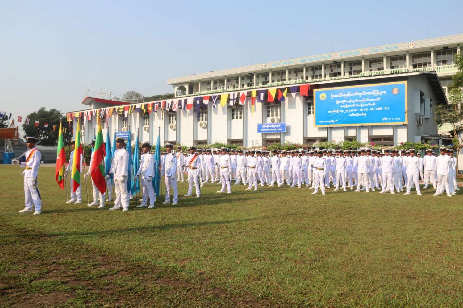ရှေးဦးစွာ ဒုတိယဝန်ကြီးချုပ်နှင့် ပြည်ထောင်စုဝန်ကြီးက ကျောင်းဆင်းတပ်ခွဲကို စစ်ဆေးပြီး စစ်ရေးပြတပ်ခွဲများက စစ်ကြောင်းပုံဖြင့် ချီတက်အလေးပြုကြသည်။ ထို့နောက် ပြည်ထောင်စုဝန်ကြီးက ကုန်သွယ်ရေကြောင်းအရာရှိလောင်း ဒီပလိုမာသင်တန်းတွင် ထူးချွန် ဆုရရှိခဲ့ကြသော စံပြအရာရှိလောင်း (ရေကြောင်း)ဆုရ သန့်လွင်အေး၊ စံပြအရာရှိလောင်း (အင်ဂျင်နီယာ)ဆုရ မင်းခန့်၊ စံပြအရာရှိလောင်း (လျှပ်စစ်နည်းပညာ)ဆုရ သာတအောင်၊ ကုန်သွယ်ရေကြောင်းအရာရှိလောင်း စာပေထူးချွန်ဆုရ ဘုန်းမြင့်မောင်၊ အင်ဂျင်နီယာ အရာရှိလောင်း စာပေထူးချွန်ဆုရ နိုင်လင်း၊ လျှပ်စစ်နည်းပညာအရာရှိလောင်း စာပေထူးချွန်ဆုရ ကျော်ဇင်မျိုးတို့ကို ဂုဏ်ပြုဆုများ ပေးအပ်ချီးမြှင့်သည်။