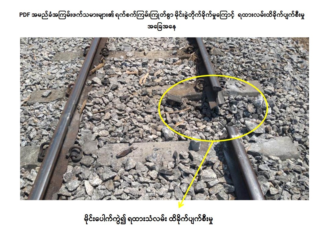 PDF အမည်ခံ အကြမ်းဖက်သမားများအနေဖြင့် ၂၀၂၁ ခုနှစ်၊ ဖေဖော်ဝါရီလ (၁)ရက်နေ့မှစ၍ ယခုအချိန်အထိ မြန်မာ့မီးရထား၏ ရန်ကုန်-ပဲခူး-မော်လမြိုင် လမ်းပိုင်းအတွင်း ရထားလမ်းများ၊ တံတားများအား ရည်ရွယ်ချက်ရှိရှိဖြင့် တံတားမိုင်းခွဲခံရမှု (၆)ကြိမ်၊ သံလမ်းမိုင်းခွဲခံရမှု (၄)ကြိမ်၊ လက်လုပ်မိုင်းပေါက်ကွဲ/တွေ့ရှိမှု (၆)ကြိမ် စုစုပေါင်း (၁၆)ကြိမ်နှင့် ဘူတာ/ဝန်ထမ်းနေအိမ်များအား မီးရှို့ဖျက်စီးခြင်း (၁)ကြိမ်တို့ကို ကျူးလွန်ခဲ့ကြောင်းနှင့် ၂၀၂၁ ခုနှစ်၊ ဖေဖော်ဝါရီလ (၁)ရက်နေ့မှစ၍ ယခုအချိန်ထိ မြန်မာ့မီးရထားလမ်း ကွန်ယက်တစ်ခုလုံးတွင် ရထားလမ်းနှင့် ရထားဘူတာ နယ်မြေအတွင်း ဗုံးထောင်၊ မိုင်းခွဲဖျက်စီးခြင်း (၁၁၀)ကြိမ်၊ ရထားတံတားများအား မိုင်းခွဲဖျက်စီးခြင်း (၃၇)ကြိမ်၊ ဘူတာများအား မီးရှို့ဖျက်စီးခြင်း (၁၁)ကြိမ်တို့ကို ကျူးလွန်ခဲ့ကြပြီးဖြစ်ကြောင်း သိရှိရသည်။