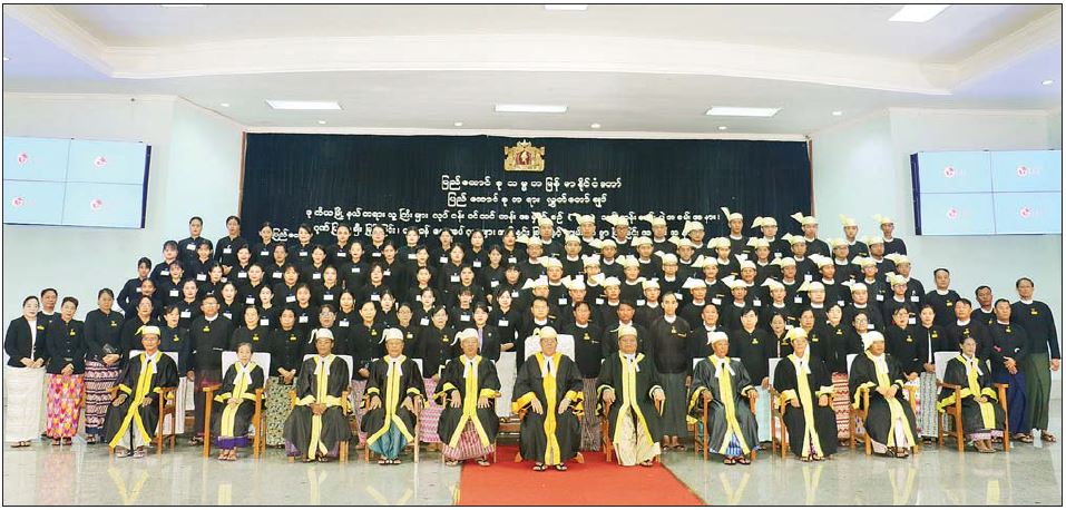 ဆက်လက်၍ တာဝန်စတင်ထမ်းဆောင်မည့် သင်တန်းသား/သင်တန်းသူ တရားရေးအရာရှိများက ပြည်ထောင်စုတရားသူကြီးချုပ်နှင့် ပြည်ထောင်စုတရားလွှတ်တော်ချုပ် တရားသူကြီးများ ရှေ့မှောက်တွင် ကျမ်းသစ္စာဆိုကြသည်။