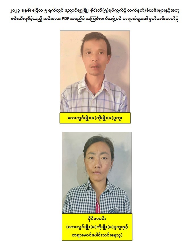 သို့ဖြစ်ပါ၍ ဖမ်းဆီးရမိတရားခံများအား ဥပဒေအရ ထိရောက်စွာအရေးယူနိုင်ရေး ဆက်လက် ဆောင်ရွက်သွားမည်ဖြစ်ပြီး အကြမ်းဖက်မှု ဆောင်ရွက်နေသူများအား ပြည်သူတစ်ရပ်လုံးက ဝိုင်းဝန်းကာကွယ်တိုက်ဖျက်ကြရန်နှင့် ပြစ်မှုကျူးလွန်ရာတွင် ပါဝင်ပတ်သက်သူများ၊ နောက်ကွယ်မှ ထောက်ပံ့ပေးလျက်ရှိသောဆက်စပ် တရားခံများအား အမြန်ဆုံးဖမ်းဆီးရမိရေးအတွက် ၎င်းတို့ပုန်းခိုရာနေရာများ၊ လှုပ်ရှားသွားလာနေထိုင်မှု သတင်းများရရှိပါက သက်ဆိုင်ရာသို့ လျှို့ဝှက်စွာသတင်းပေး တိုင်ကြားနိုင်ပါကြောင်း၊ သတင်းပေးသူနှင့် ဖမ်းဆီးပေးသူများအားထိုက်တန်စွာ လျှို့ဝှက်၍ ဆုငွေများချီးမြှင့်ပေးမည်ဖြစ်ကြောင်းနှင့် မြို့ရွာများ အမြန်ဆုံးအေးချမ်း တည်ငြိမ်ရေးနှင့် မဟာသင်္ကြန်ကာလအတွင်း ပြည်သူများ အေးချမ်းပျော်ရွှင်စွာ ရေကစားနိုင်ရေးတို့အတွက် ပြည်သူတစ်ရပ်လုံး ပူးပေါင်းပါဝင်ကြိုးပမ်းဆောင်ရွက်နိုင်ပါရန် မေတ္တာရပ်ခံအပ်ပါကြောင်း အသိပေးသတင်းထုတ်ပြန်အပ်ပါသည်။