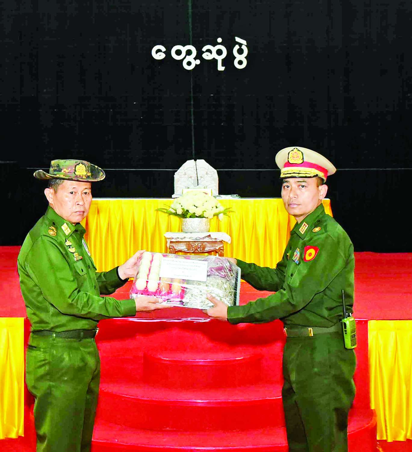 တွေ့ဆုံပွဲအပြီးတွင် နိုင်ငံတော်စီမံအုပ်ချုပ်ရေးကောင်စီဒုတိယဥက္ကဋ္ဌ ဒုတိယတပ်မတော်ကာကွယ်ရေးဦးစီးချုပ်ကာကွယ်ရေးဦးစီးချုပ်(ကြည်း) ဒုတိယဗိုလ်ချုပ်မှူးကြီး စိုးဝင်းကနည်းပြများနှင့် သင်တန်းသားများအတွက် တပ်မတော်စက်ရုံများမှထုတ်လုပ်သည့် စားသောက်ကုန်ပစ္စည်းများကိုပေးအပ်ရာ တာဝန်ရှိသူများက လက်ခံရယူသည်။ ဆက်လက်၍ ညှိနှိုင်းကွပ်ကဲရေးမှူး(ကြည်း၊ ရေ၊ လေ) ဗိုလ်ချုပ်ကြီး မောင်မောင်အေးက အားကစားပစ္စည်းများကိုပေးအပ်ရာ တာဝန်ရှိသူများက လက်ခံရယူကြသည်။
