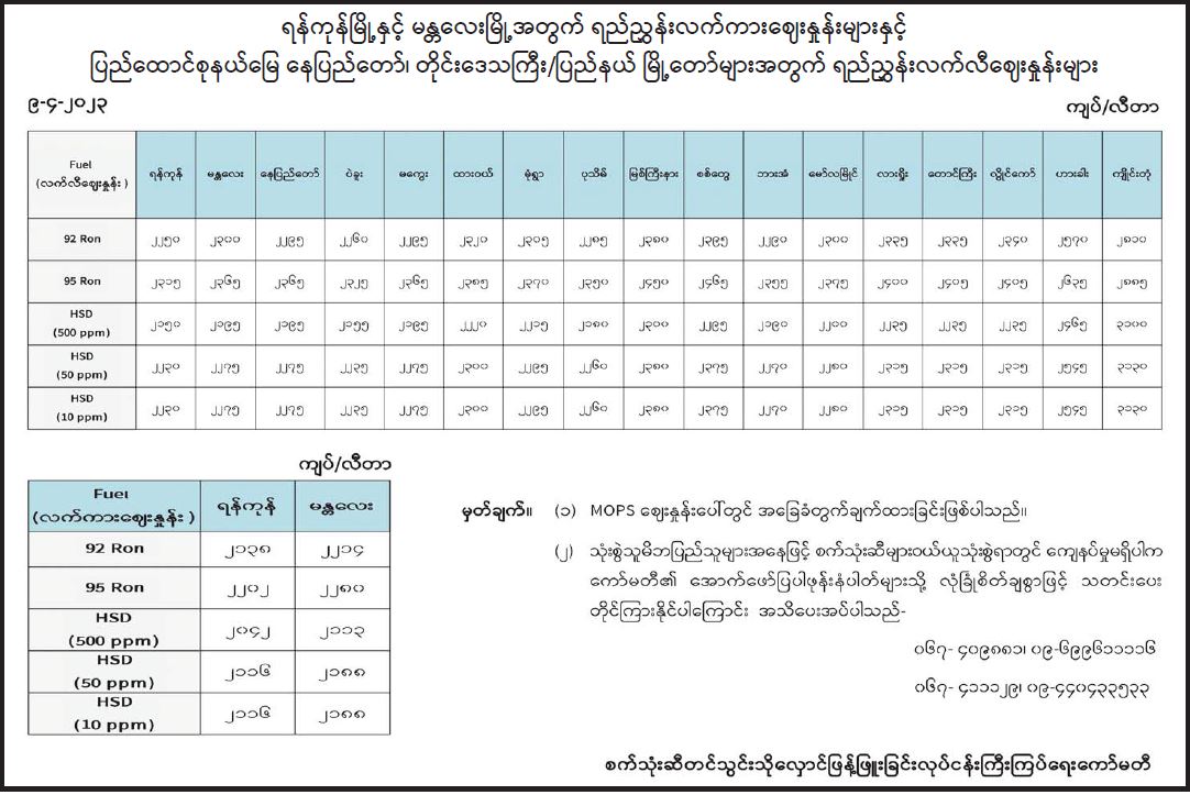 ရန်ကုန်မြို့နှင့် မန္တလေးမြို့အတွက် ရည်ညွှန်းလက်ကားဈေးနှုန်းများနှင့် ပြည်ထောင်စုနယ်မြေ နေပြည်တော်၊ တိုင်းဒေသကြီး/ပြည်နယ် မြို့တော်များအတွက် ရည်ညွှန်းလက်လီဈေးနှုန်းများ 04/09/2023