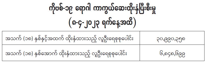ကိုဗစ်-၁၉ ရောဂါကာကွယ်ထိန်းချုပ်ရေးအတွက် တိုင်းဒေသကြီး/ပြည်နယ်များတွင် ကိုဗစ်-၁၉ ရောဂါကာကွယ်ဆေးကို ဦးတည်အုပ်စုများသတ်မှတ်၍ ထိုးနှံပေးလျက်ရှိရာ (၈-၄-၂၀၂၃) ရက်နေ့အထိ အသက်(၁၈)နှစ်နှင့်အထက် လူဦးရေစုစုပေါင်း (၃၀,၉၉၀,၃၅၈) ဦးနှင့် အသက်(၁၈)နှစ်အောက် လူဦးရေစုစုပေါင်း (၆,၈၄၈,၆၉၉) ဦးတို့အား ထိုးနှံထားရှိပြီးဖြစ်ပါသည်။